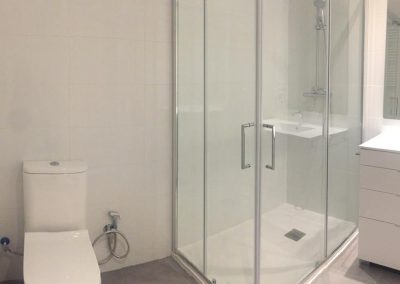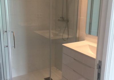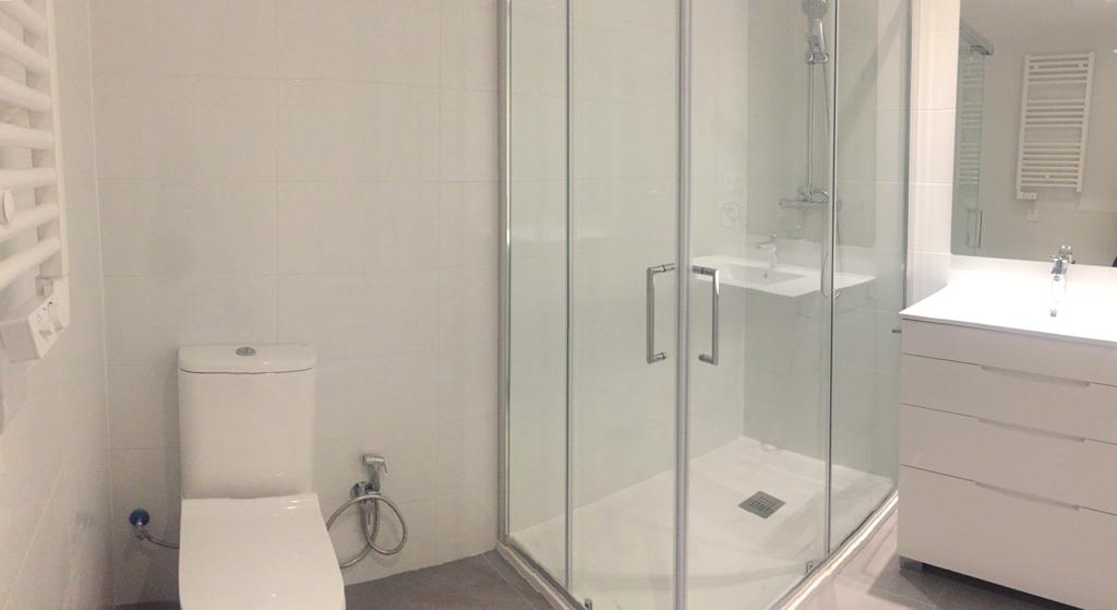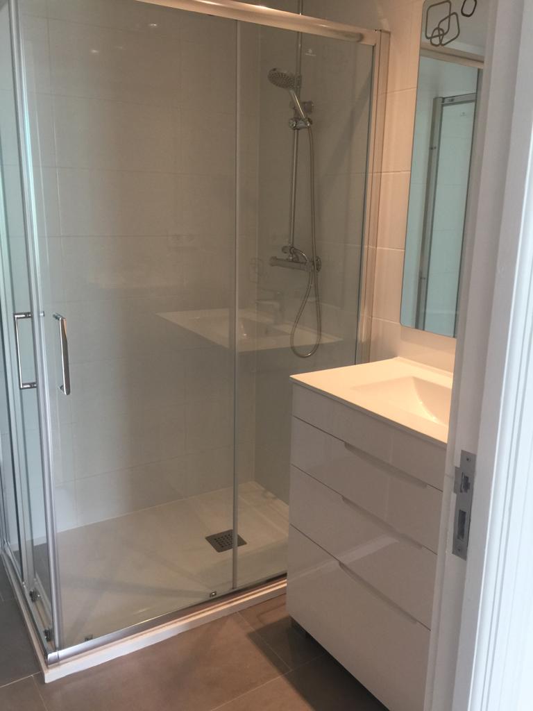 El baño se reformó por completo también (incluido tuberías) incorporando un mueble de lavabo de almacenaje. Se eliminó el bidé y la bañera se cambio por un plato de ducha.  El mármol se sustituyó por un suelo de baldosa gris y unas paredes con azulejos blancos, siempre recordando la finalidad de dar una imagen limpia y neutra, para poner la vivienda en el mercado de alquiler.