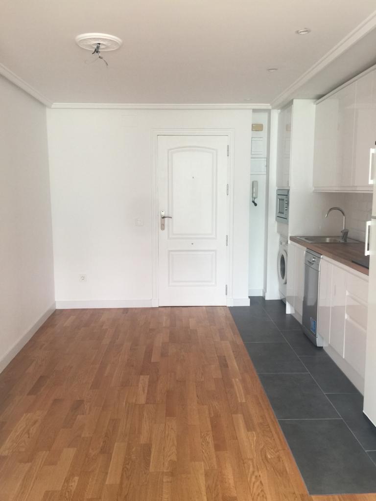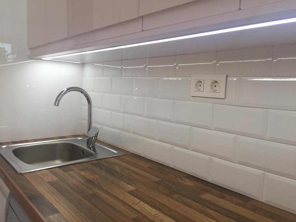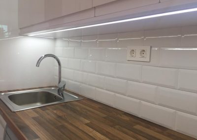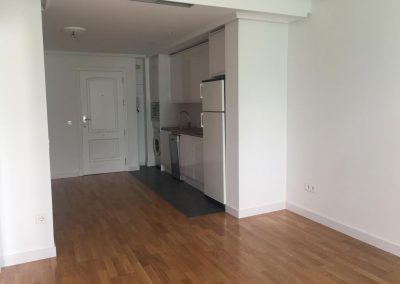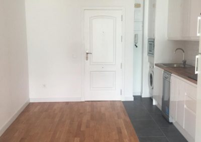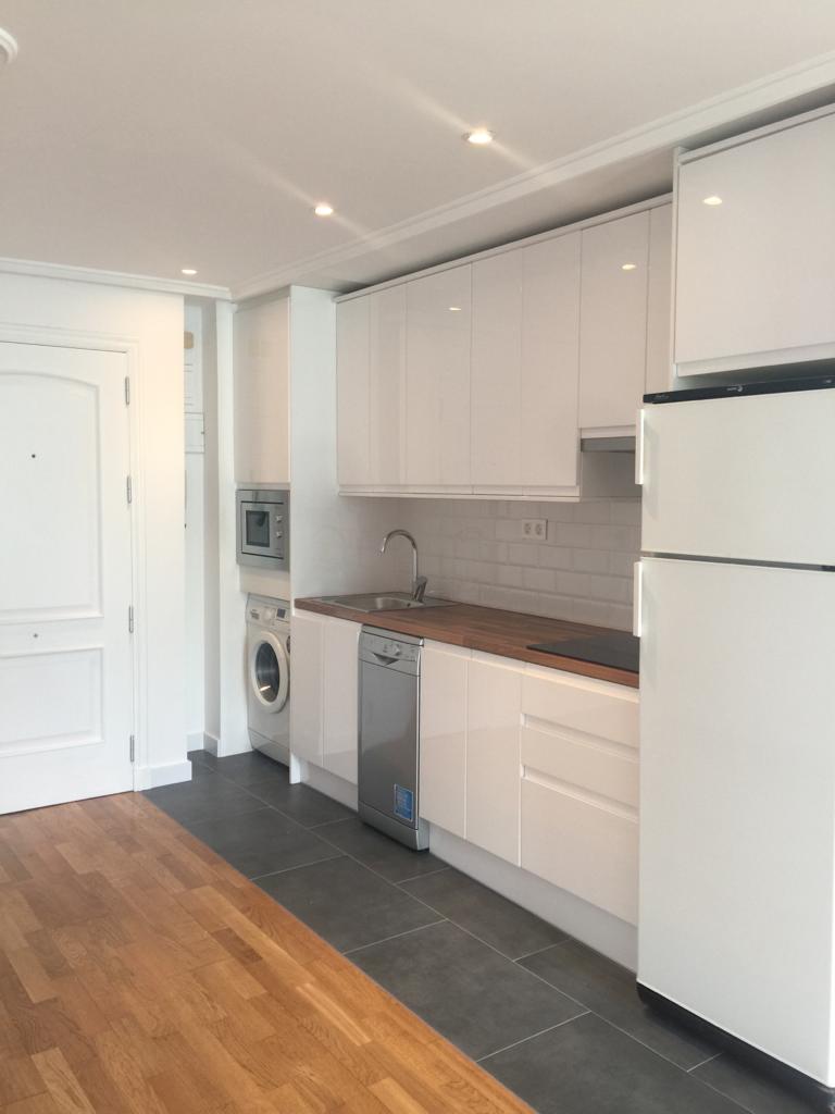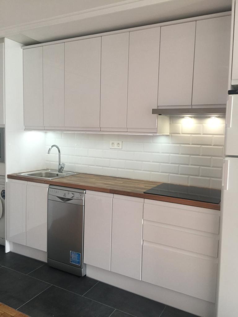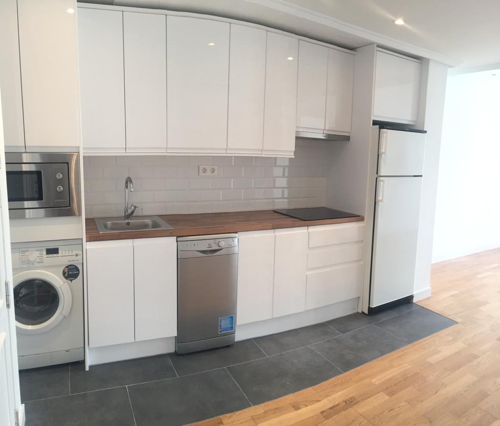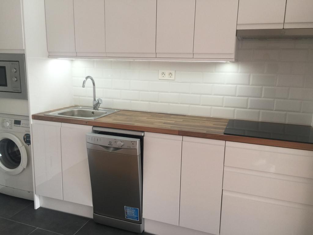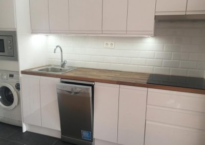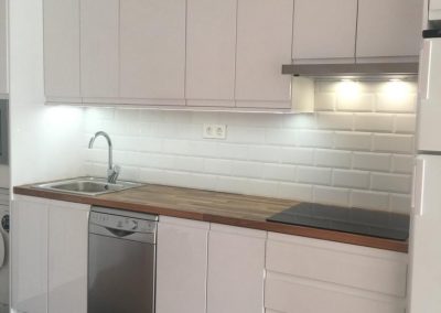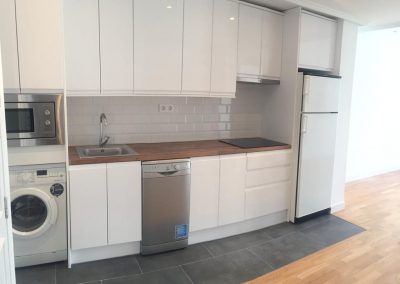 En la cocina se optó por un mueble blanco-brillo con uñero, con una encimera corrida de madera, dando una imagen limpia y neutra de la misma. Se cambió el frente de espejo que tenía por unas baldosas blancas, mucho mas práctico para su limpieza. El mayor cambio fue la demolición de un armario donde estaba guardada la lavadora, para dar un aspecto mas lineal y aprovechar mejor el espacio. De hecho se pudo incorporar un lavavajillas de 45, mucho mas atractivo a la hora de alquilar un piso pequeño de estar características.