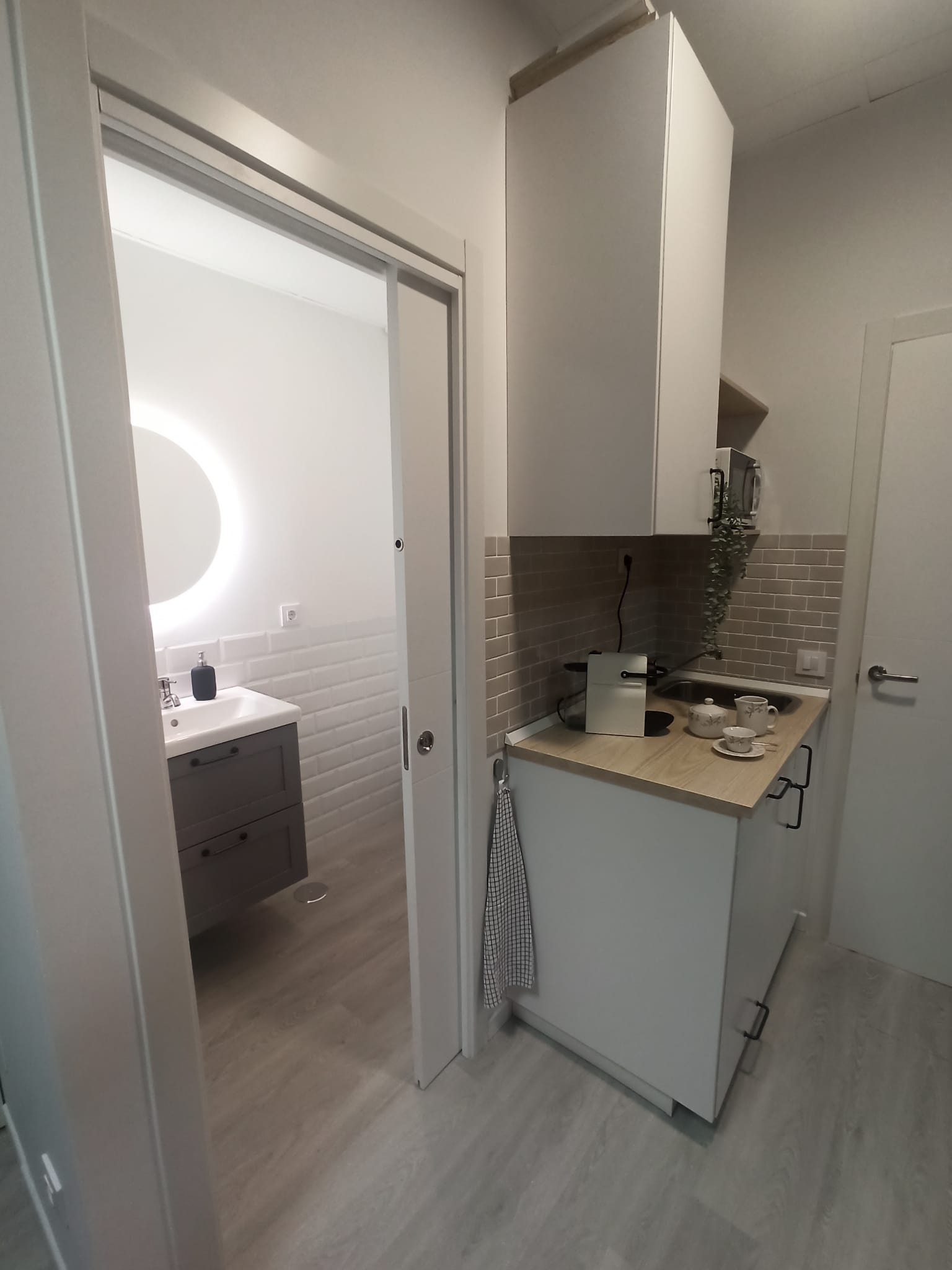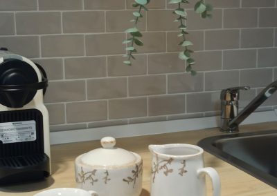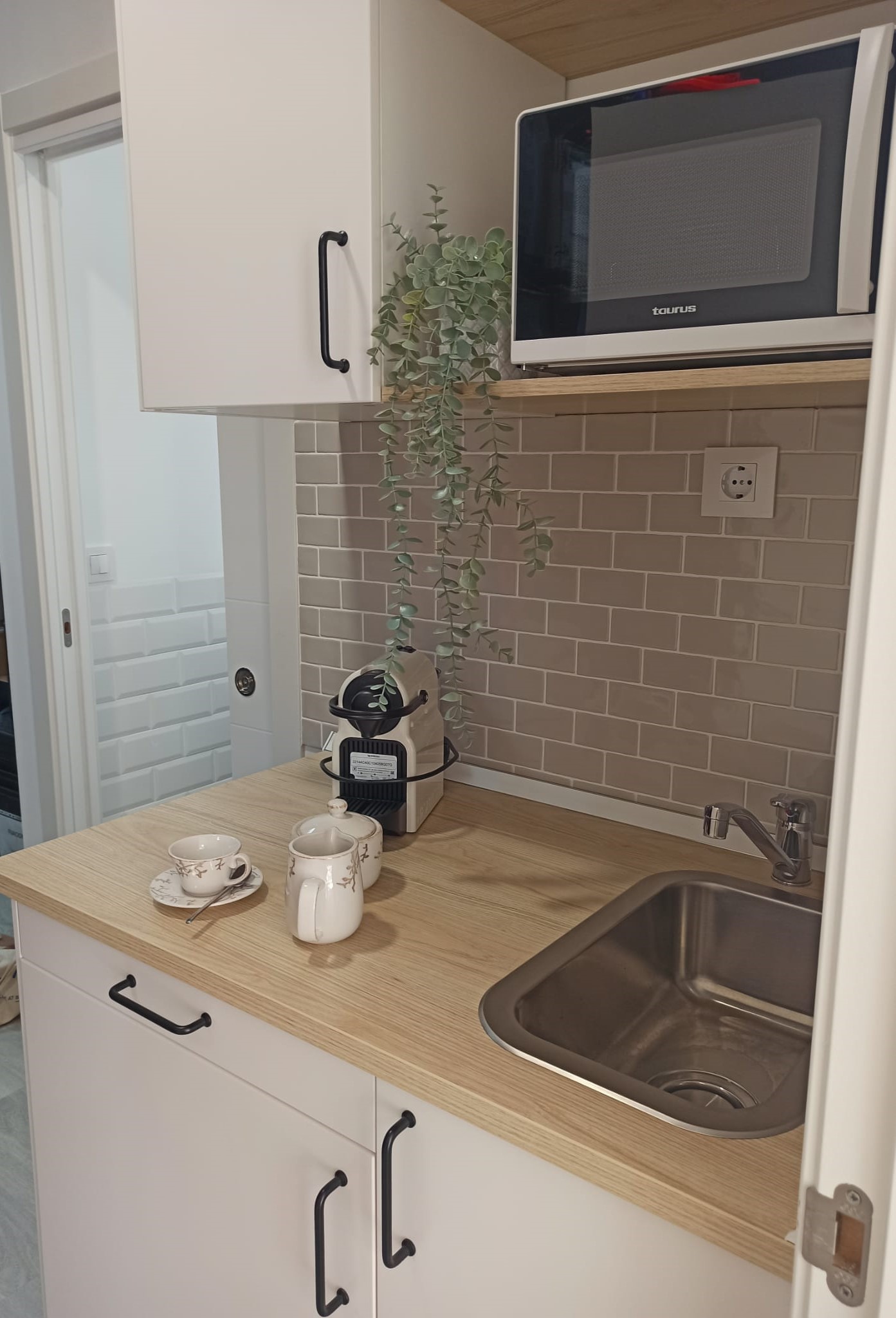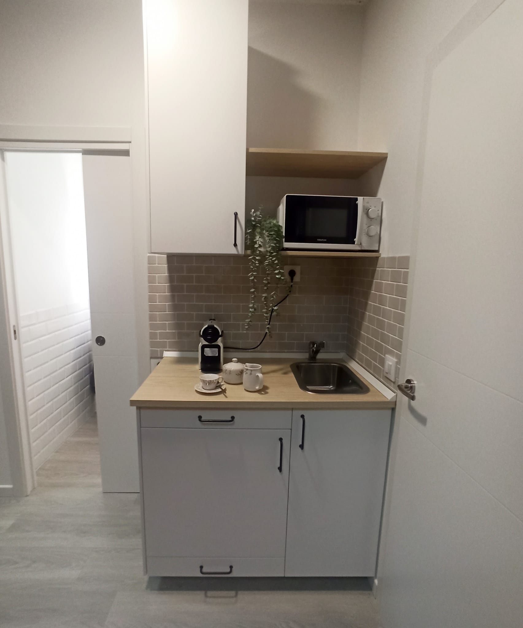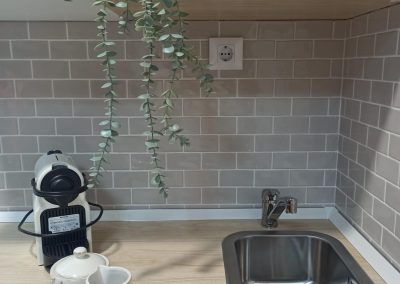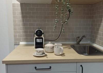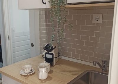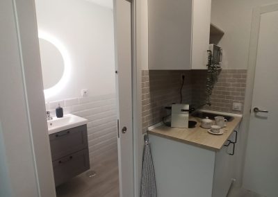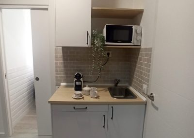 Realizamos una nueva distribución consiguiendo una gran capacidad de almacenaje interior y colocamos dos grandes armarios, para completar esa necesidad. Renovamos toda la instalación eléctrica para poder apoyar el día a día de las necesidades de la empresa, reducimos y reposicionamos el aseo, jugando con revestimientos sencillos. Colocamos una pequeña cocina con una zona de lavado, nevera, microondas, cafetera y zona de almacenaje. Sencilla, pero perfecta para el uso diario.