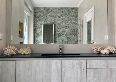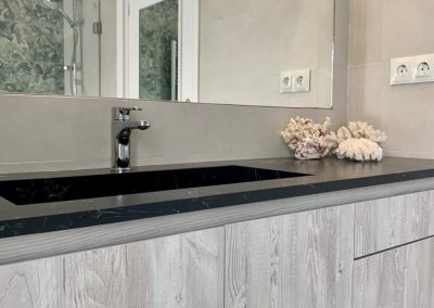 en gris antracita veteada que le aporta al mueble elegancia y sofisticación. Como elemento decorativo se realiza una