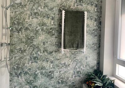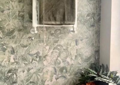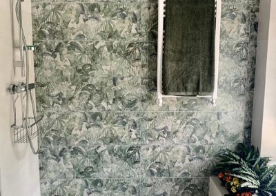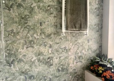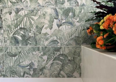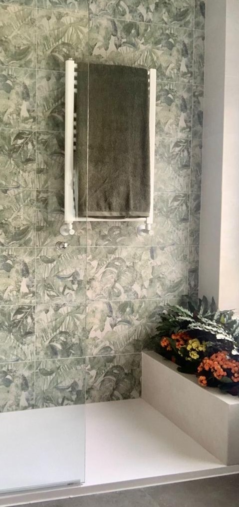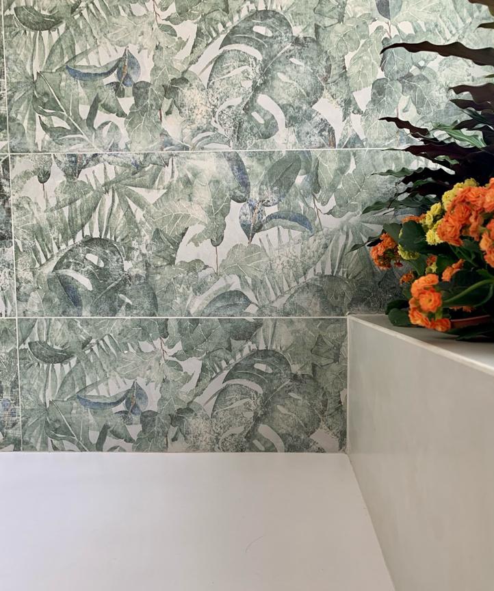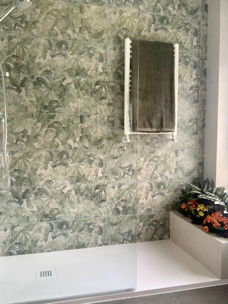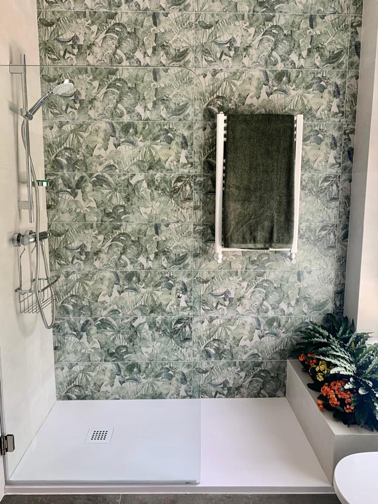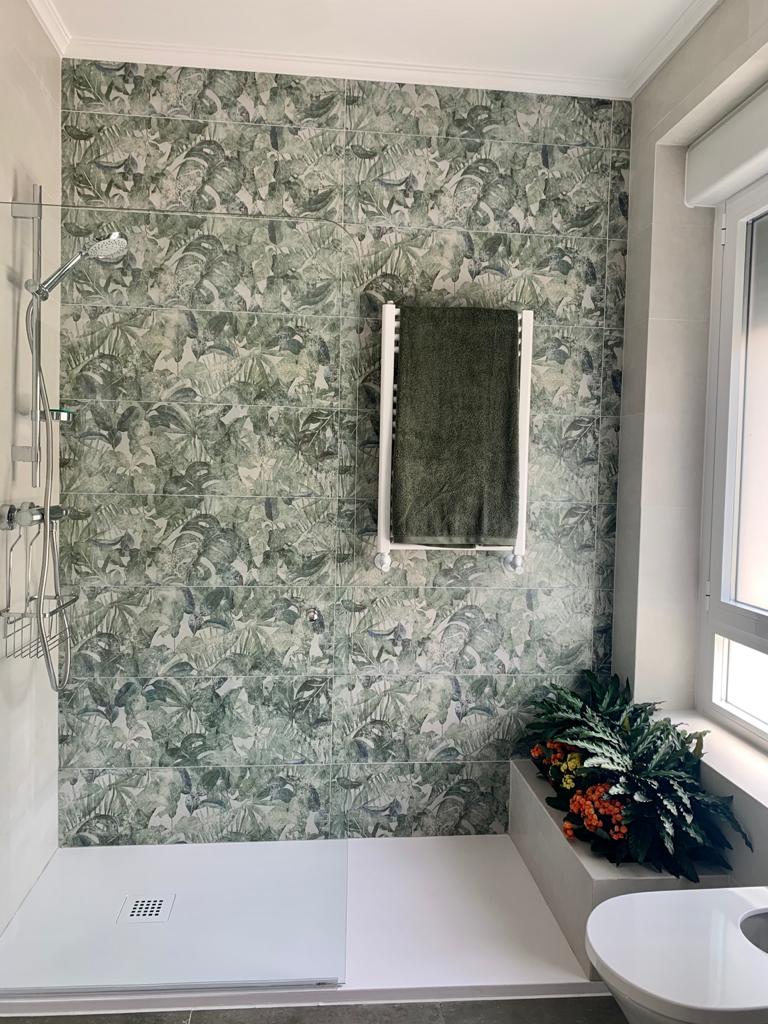muy actual en la zona de la ducha, donde se elige un motivo vegetal, muy acorde con la jardinera que el baño ya disponía