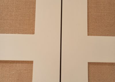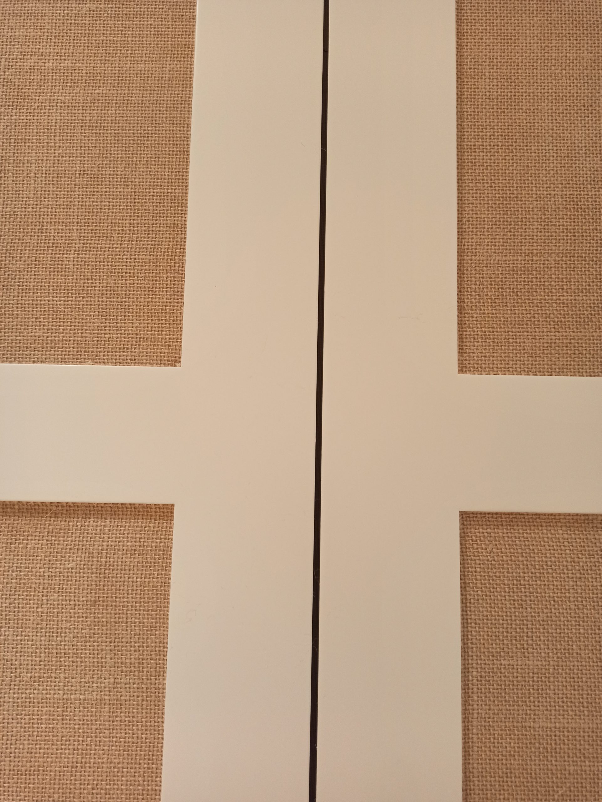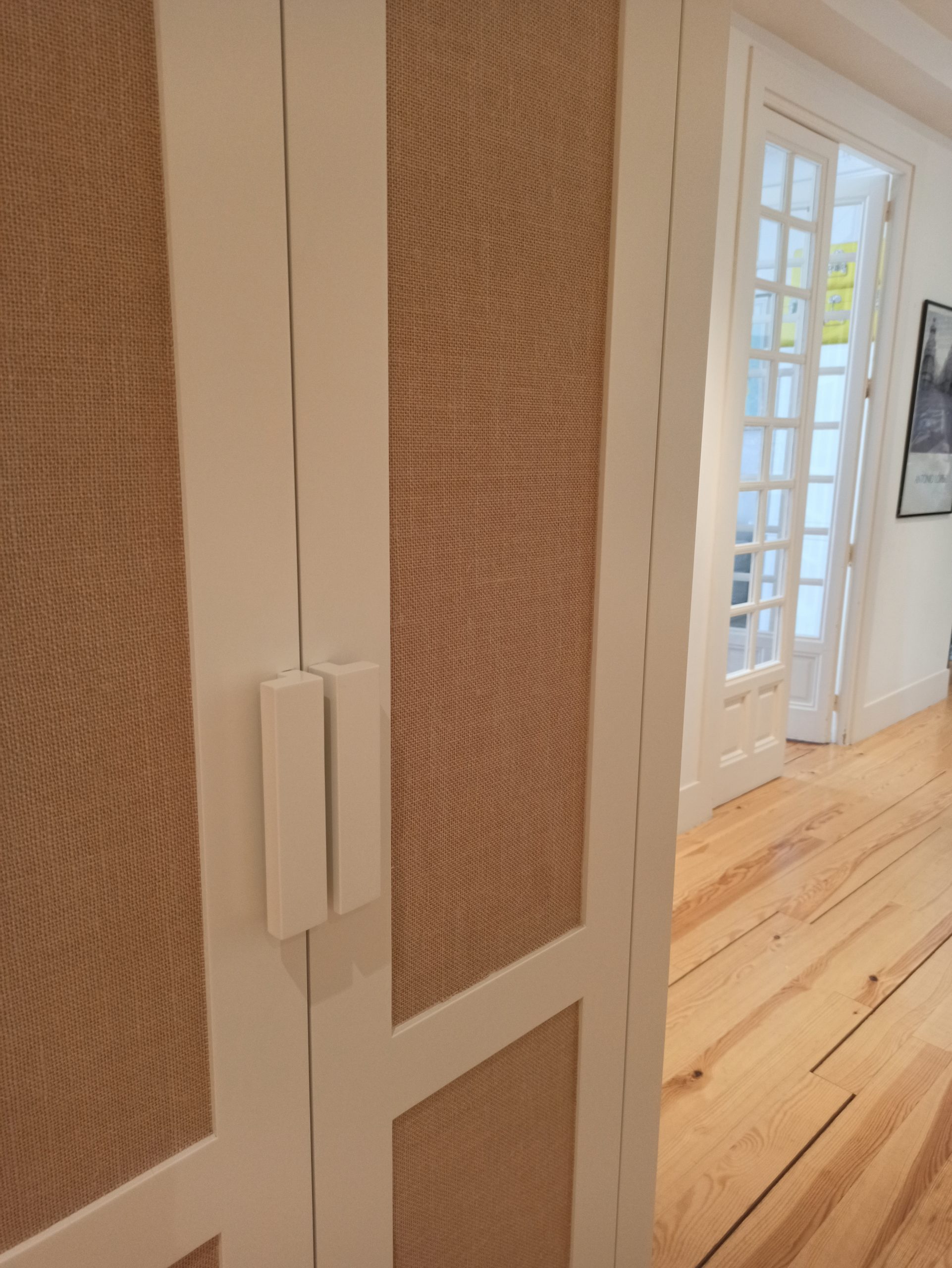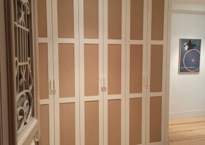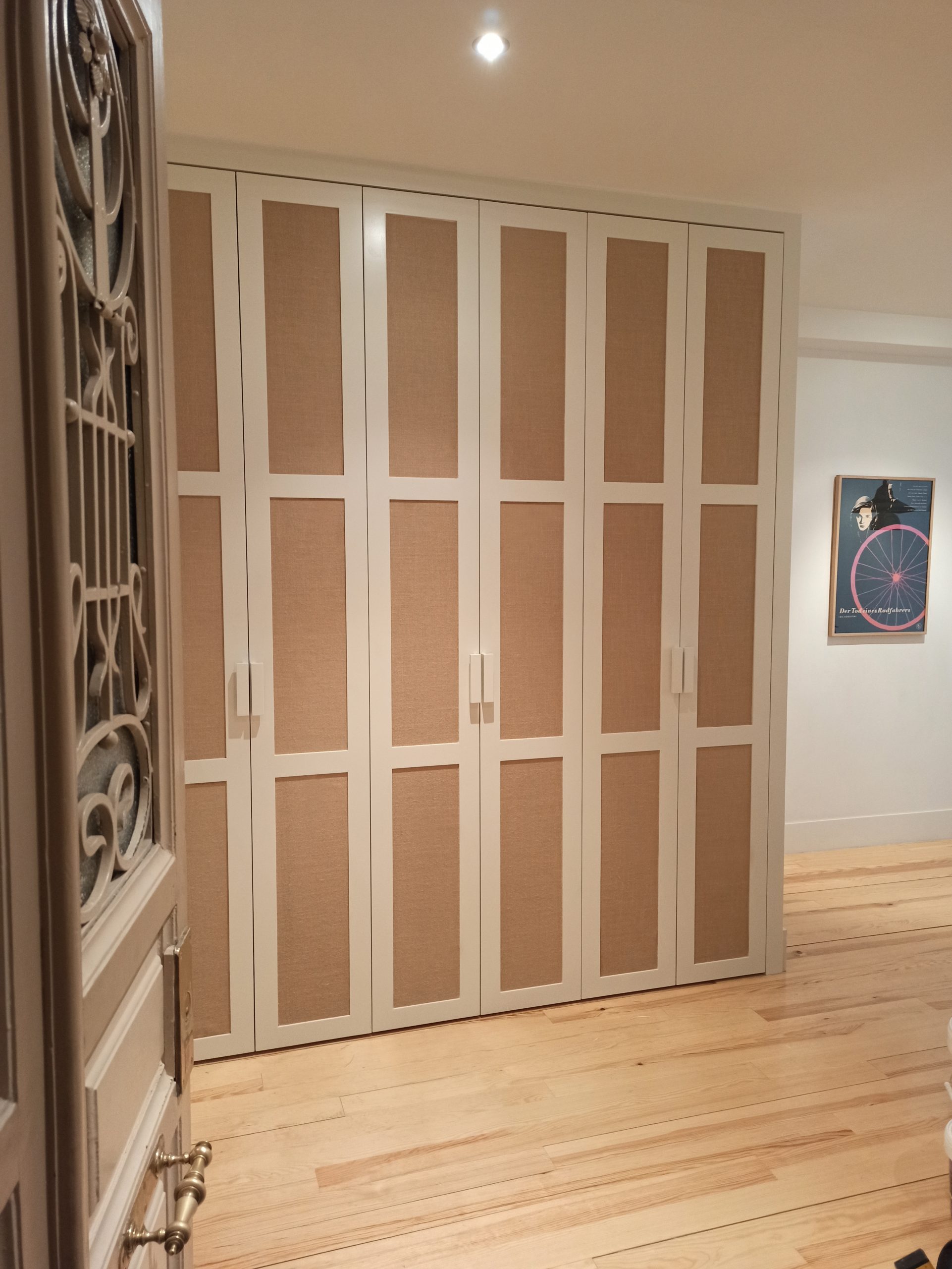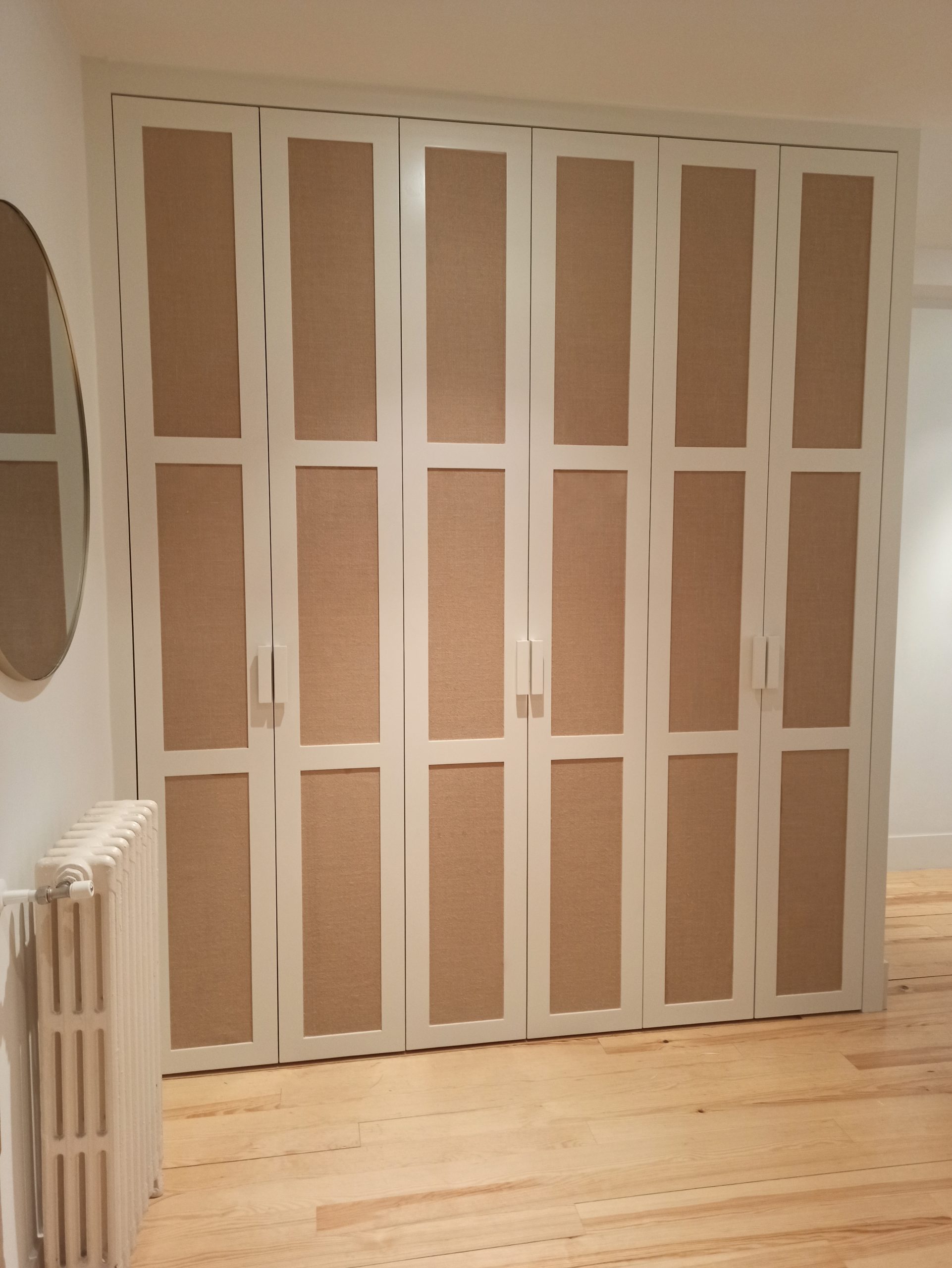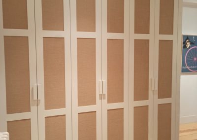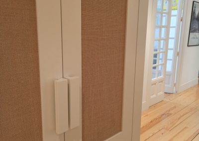 Se realiza un armario de tres cuerpos con puertas con cuarterones tapizados con un papel vinílico que imita a una tela arpillera, que le proporciona un aspecto cálido y diferente combinando perfectamente con el resto de la vivienda.