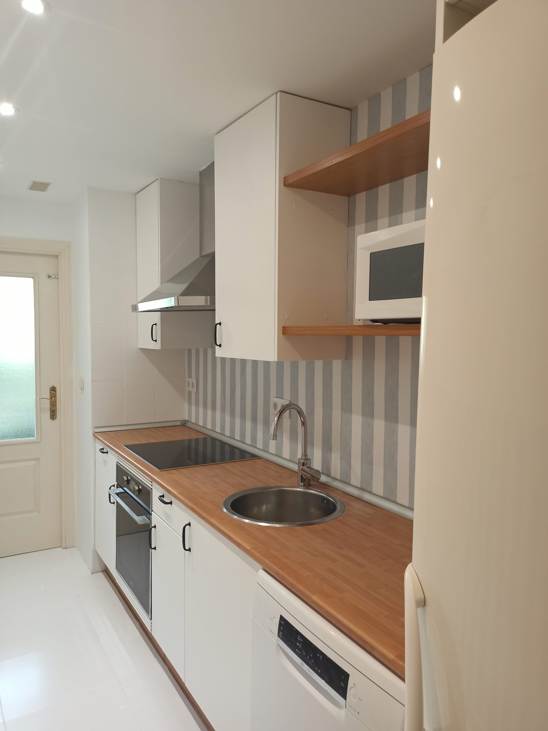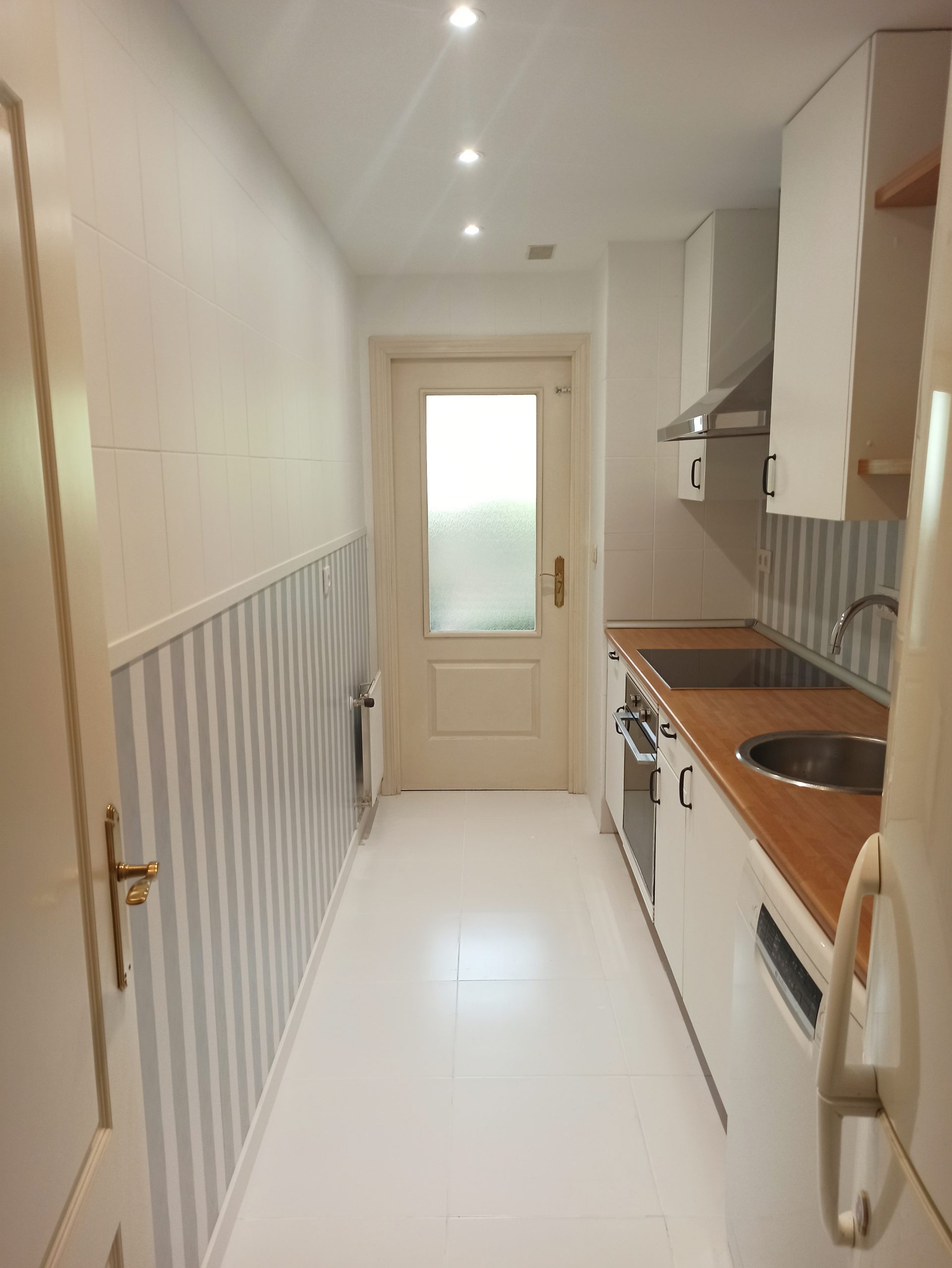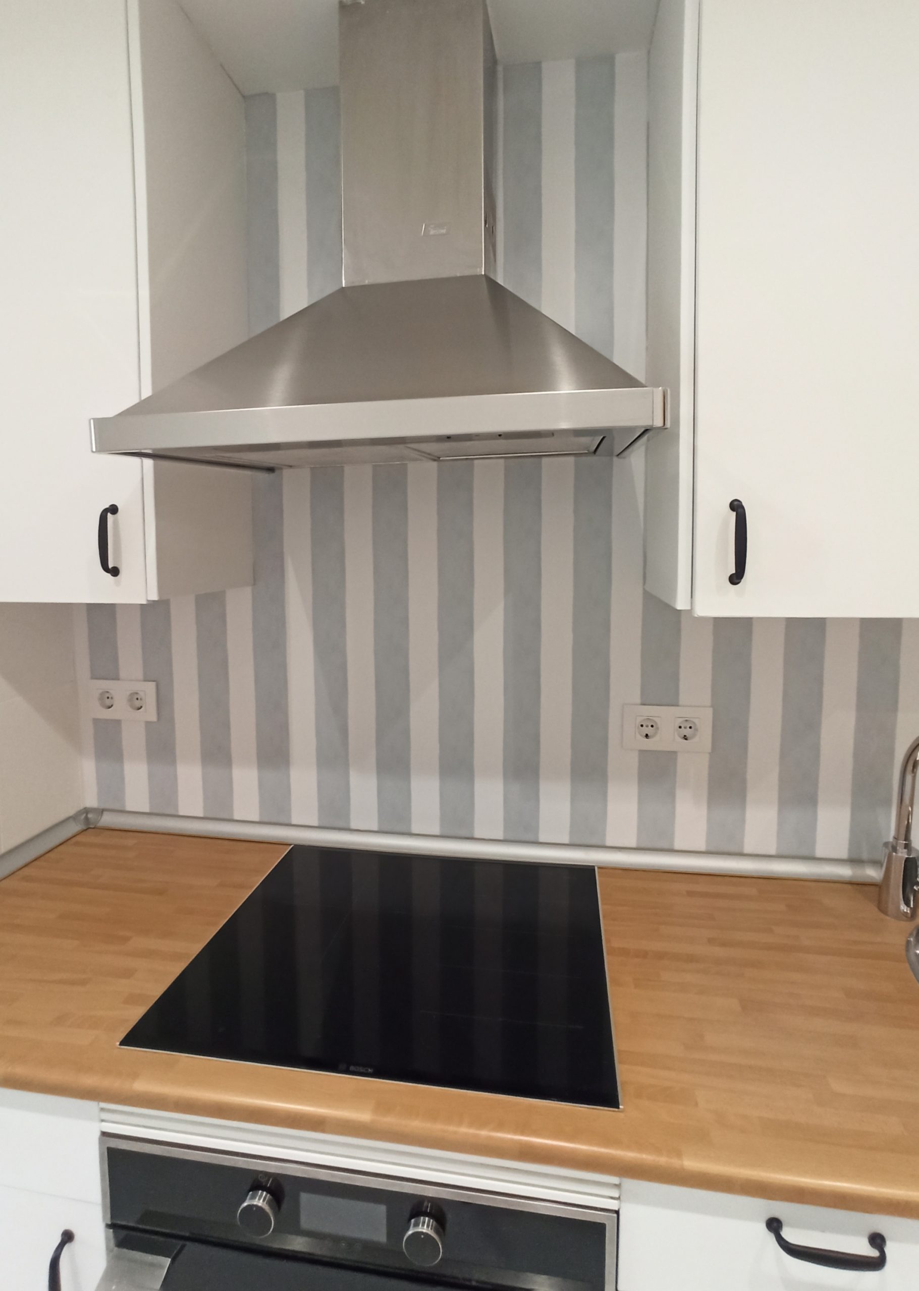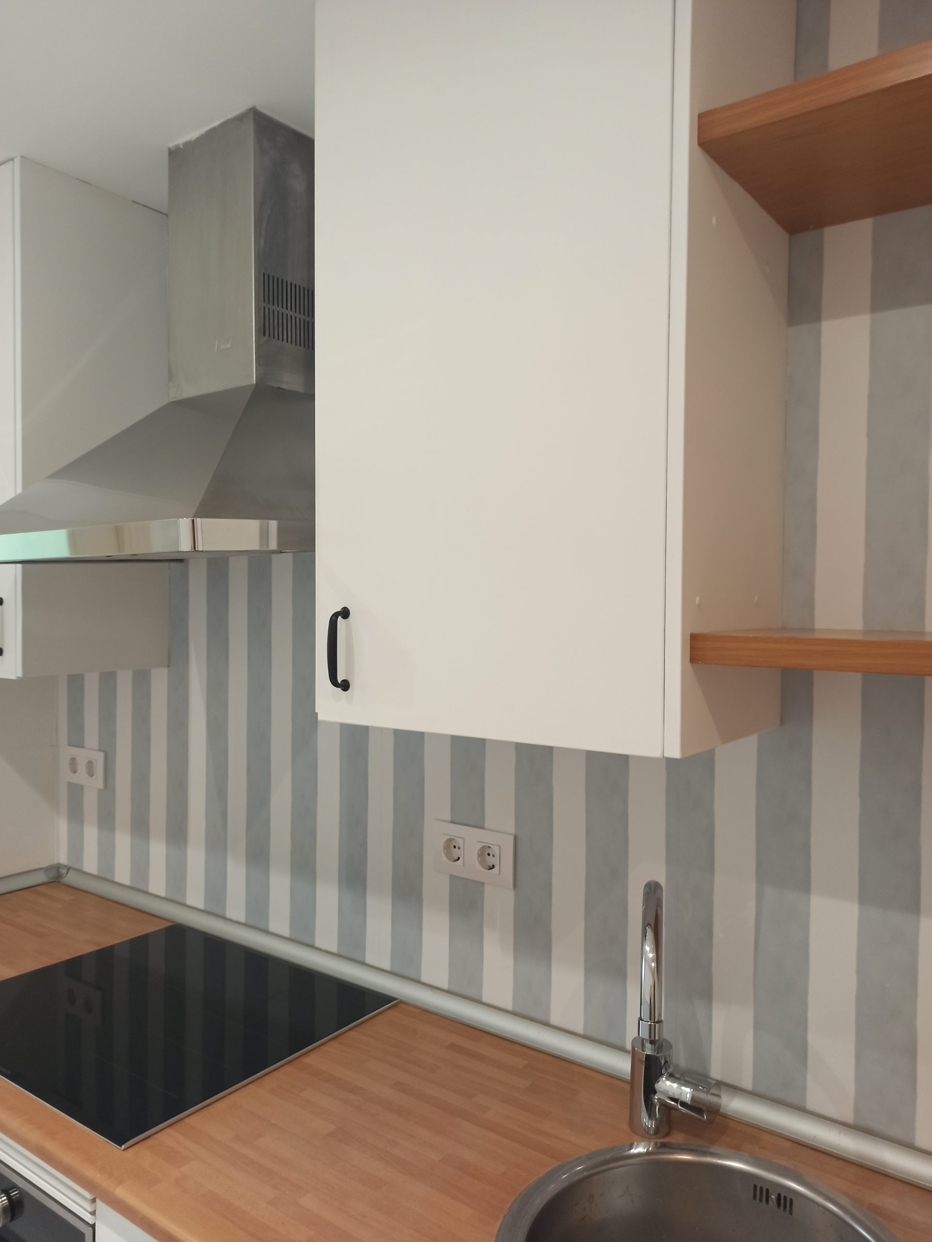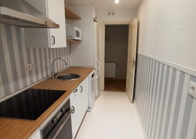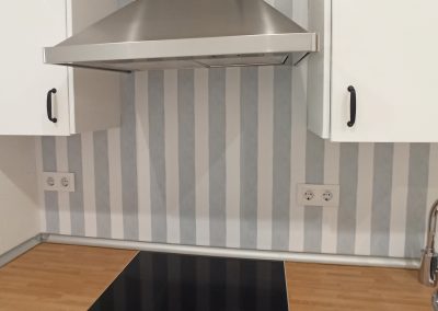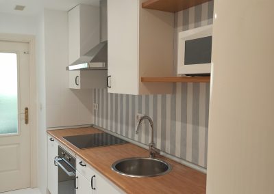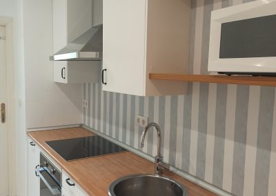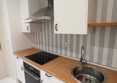 Mejoramos la iluminación en baños, saneamos techos, revisamos interruptores colocando algunos en lugares estratégicos, se pinta toda la vivienda en tonos neutros, se lija y barniza el piso completo y, sobre todo le damos una nueva “vida” a la cocina sin tocar ni cambiar los muebles. Recurrimos a vinilos especiales para cocinas y baños en algunos paramentos de la cocina en rayas suaves; a pintura especial de baldosas y muebles y a un simple cambio de tiradores. El cambio de aspecto de la estancia es espectacular y la cocina recupera un aspecto luminoso y nuevo a pesar de no haber hecho un cambio completo. Mejoramos de igual forma la iluminación de la cocina incrementando el brillo y luminosidad de la misma.