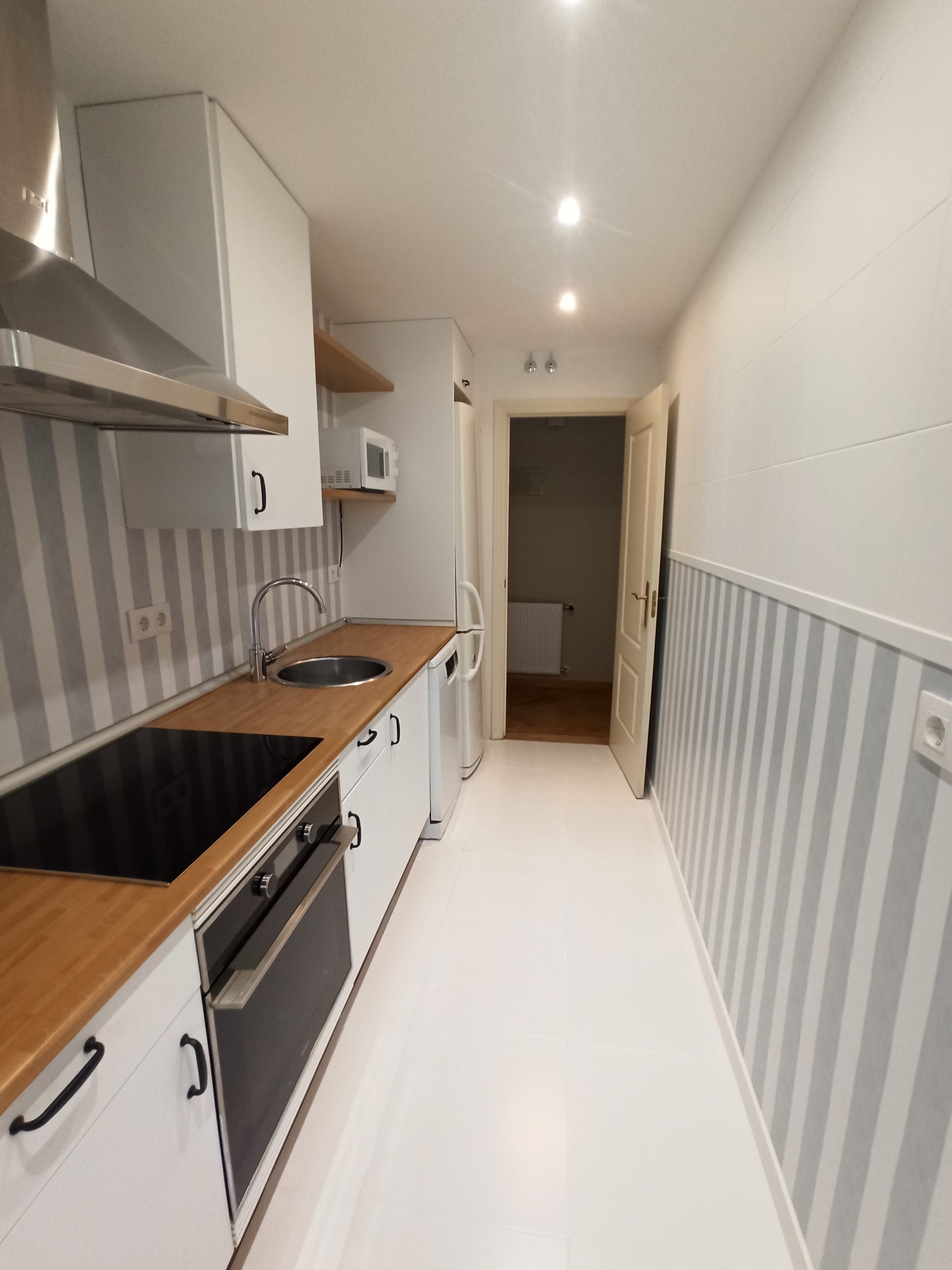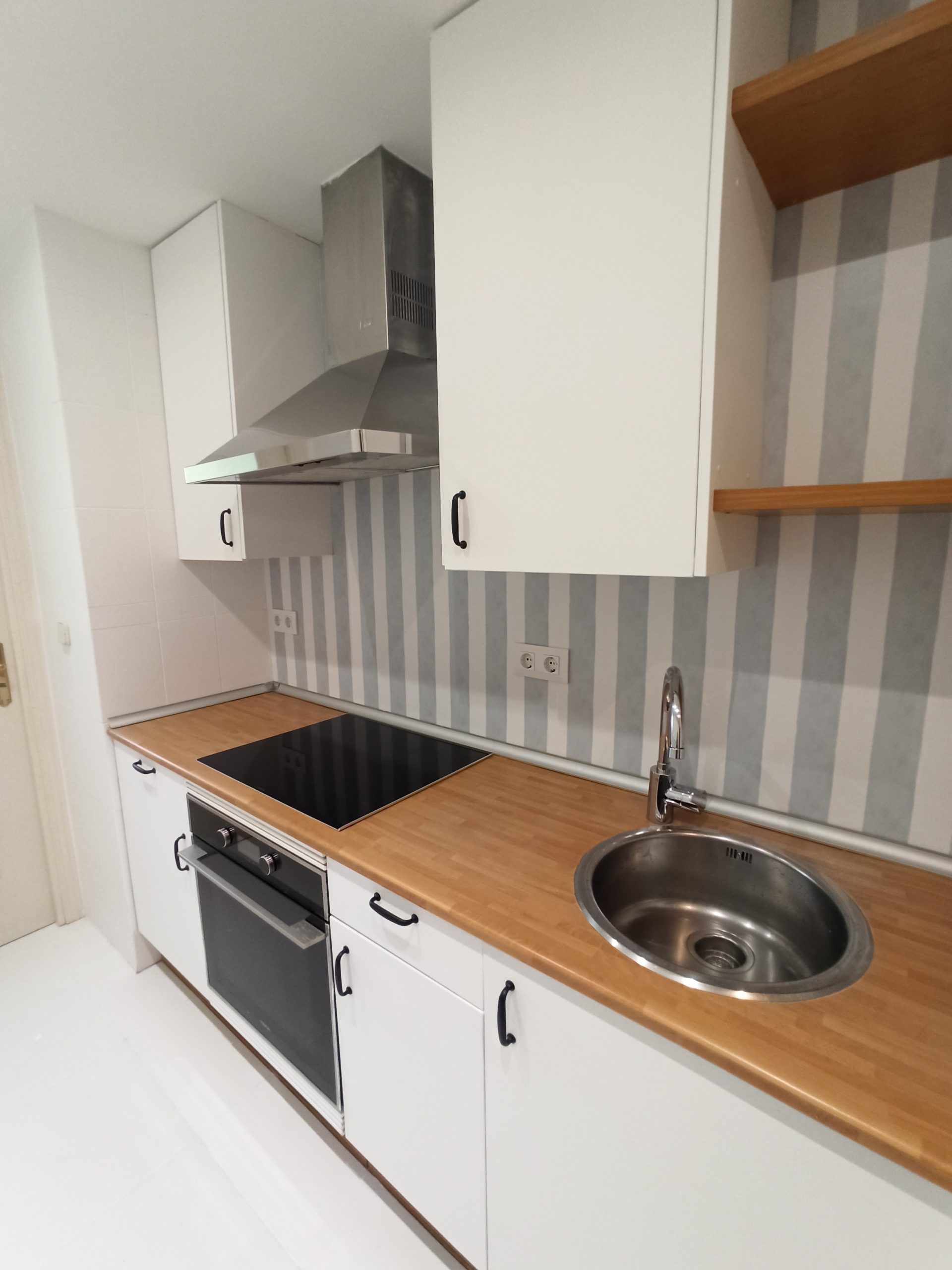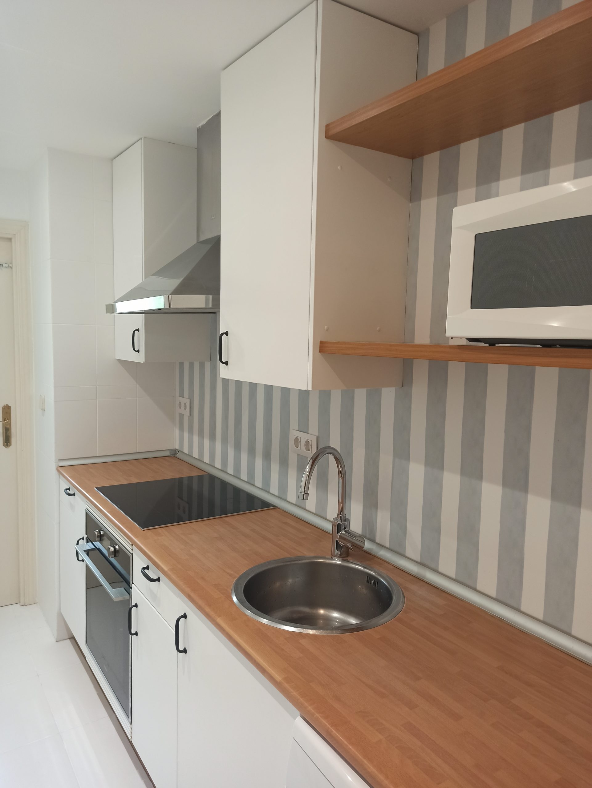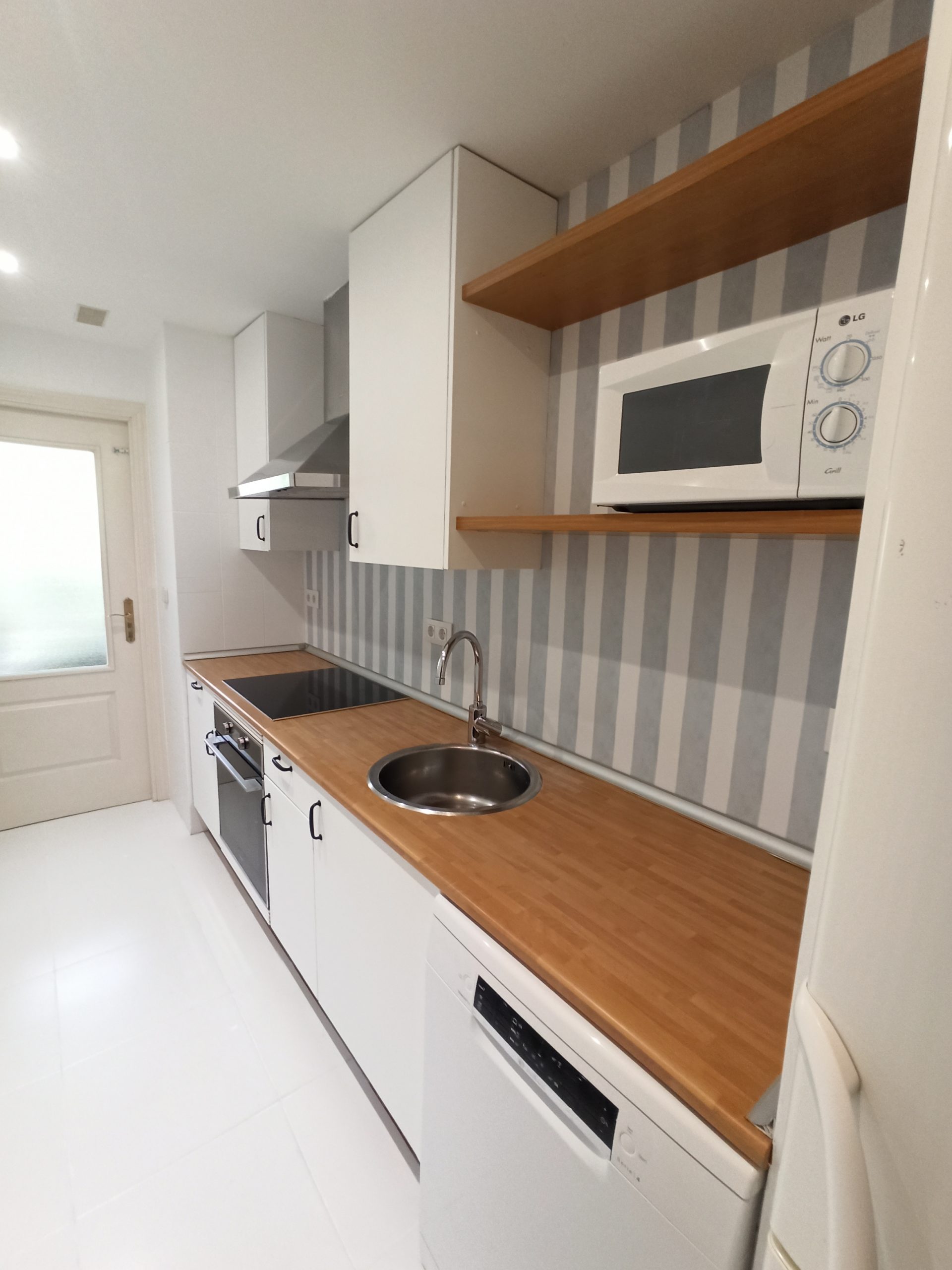 Mejoramos la iluminación en baños, saneamos techos, revisamos interruptores colocando algunos en lugares estratégicos, se pinta toda la vivienda en tonos neutros, se lija y barniza el piso completo y, sobre todo le damos una nueva “vida” a la cocina sin tocar ni cambiar los muebles. Recurrimos a vinilos especiales para cocinas y baños en algunos paramentos de la cocina en rayas suaves; a pintura especial de baldosas y muebles y a un simple cambio de tiradores. El cambio de aspecto de la estancia es espectacular y la cocina recupera un aspecto luminoso y nuevo a pesar de no haber hecho un cambio completo. Mejoramos de igual forma la iluminación de la cocina incrementando el brillo y luminosidad de la misma.