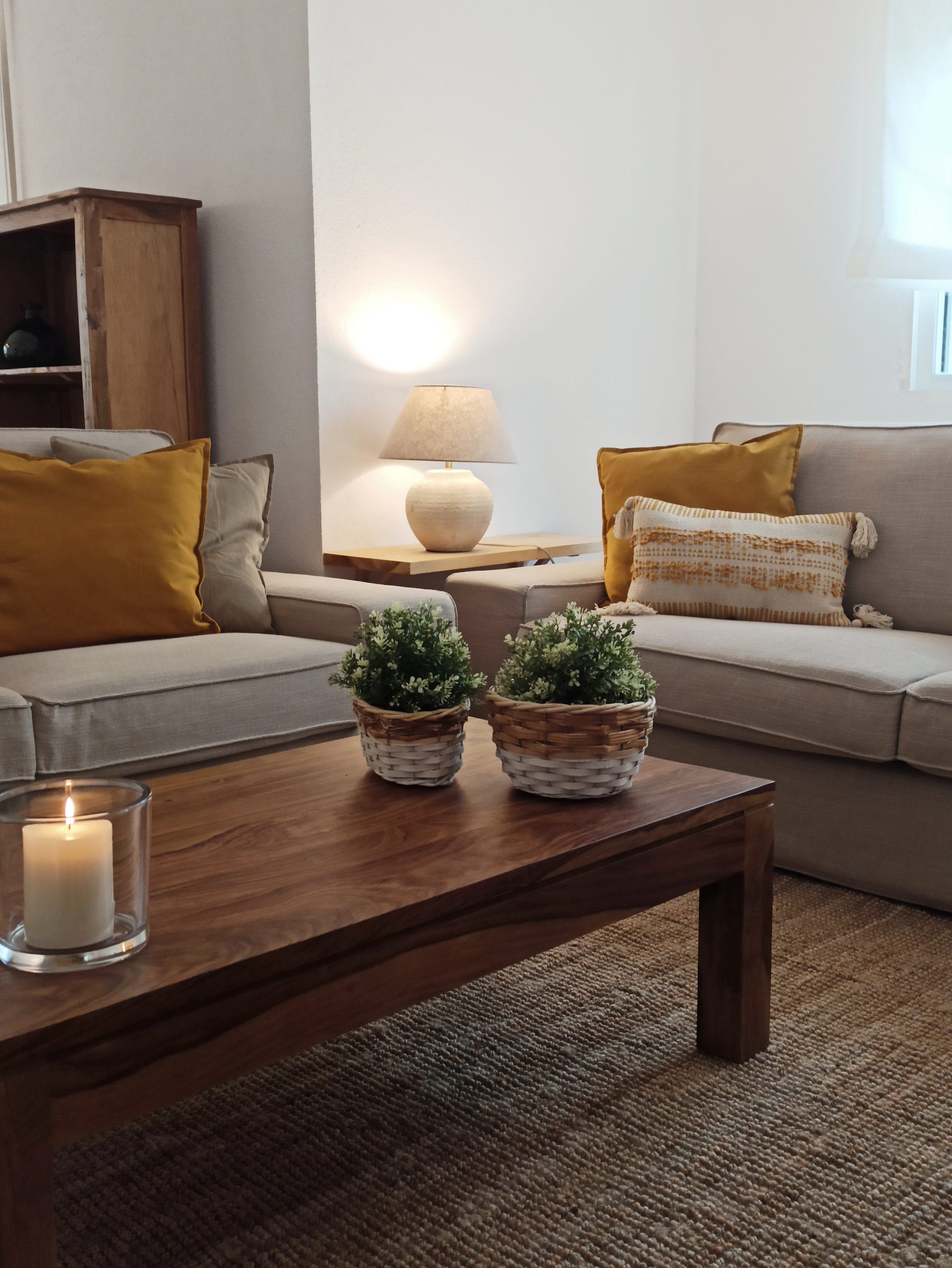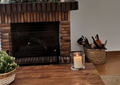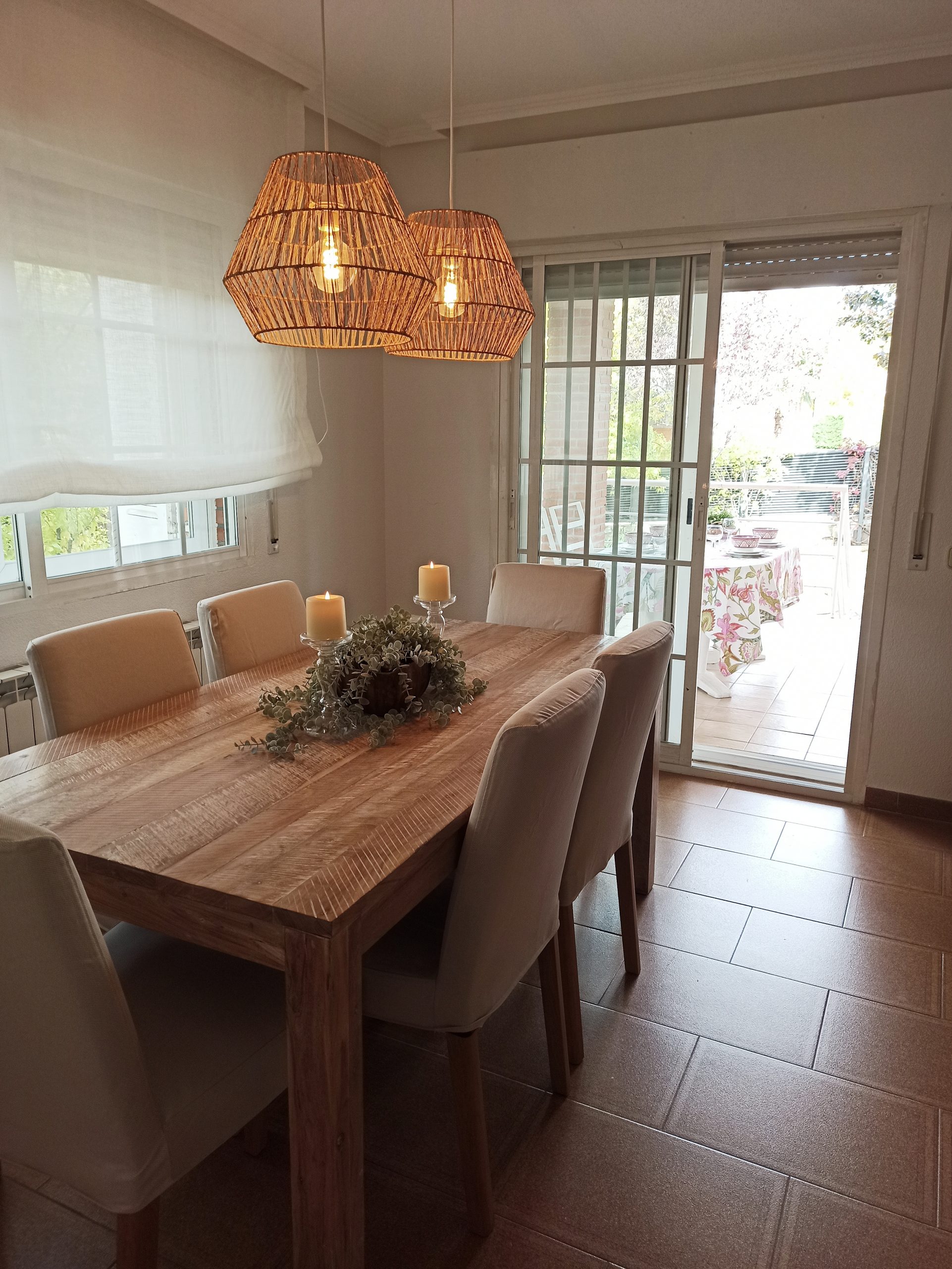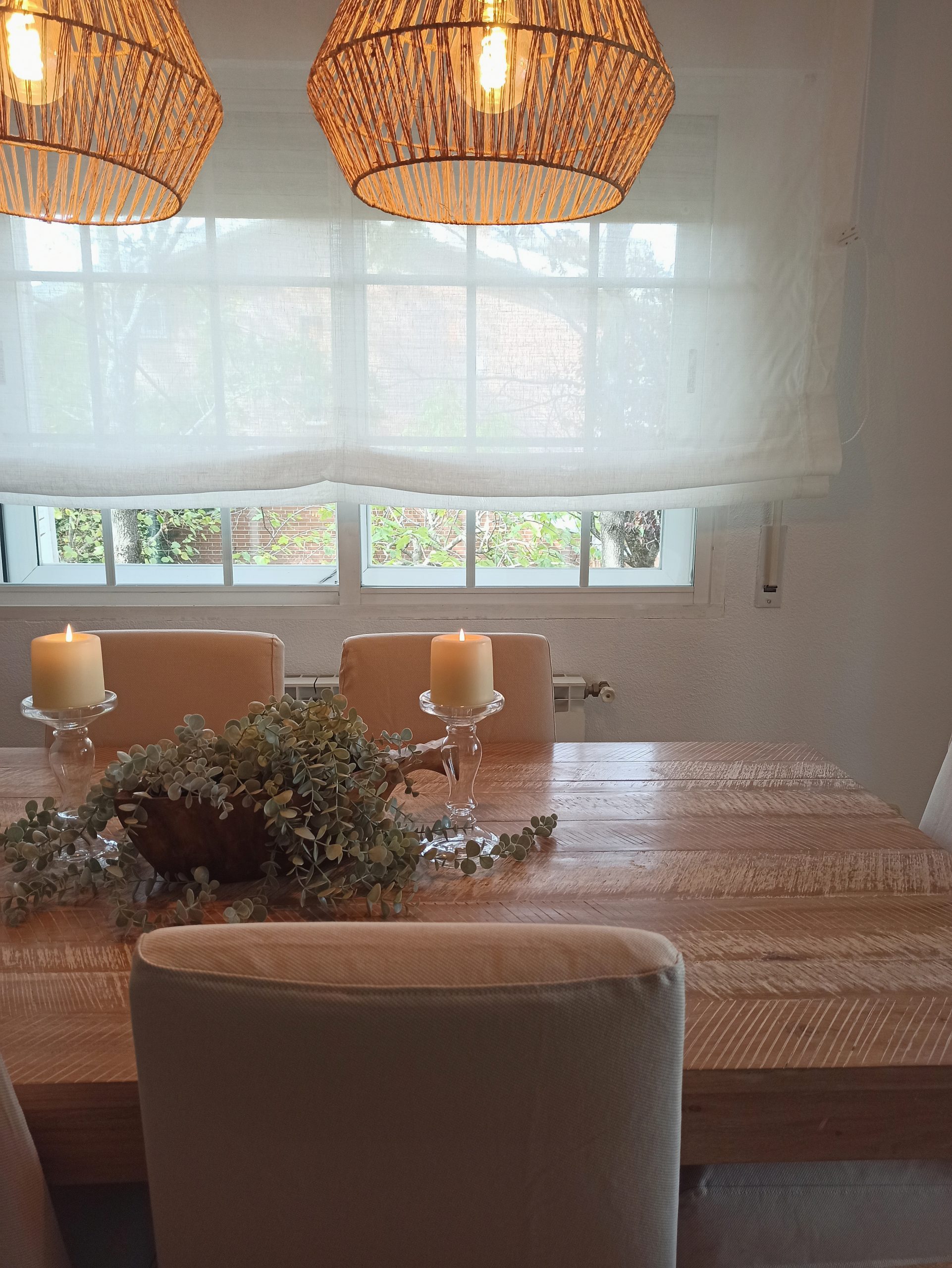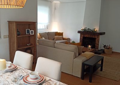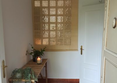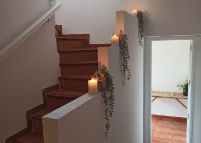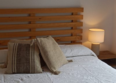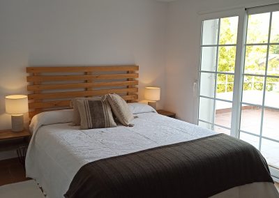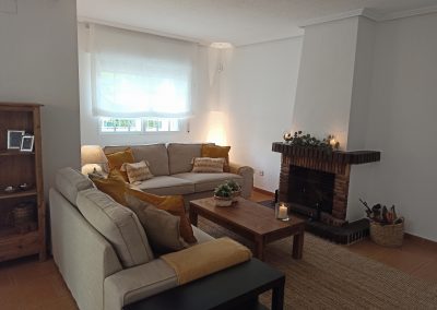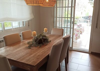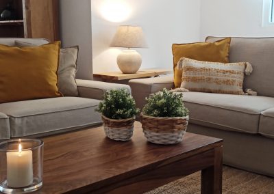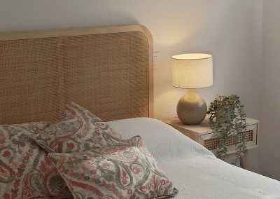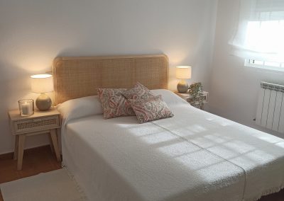 En cuanto al capítulo de decoración, y acorde al gusto de los clientes, se realiza un proyecto sencillo, con muebles de madera natural, y confecciones suaves (una diferente por cada estancia). Colchas blancas portuguesas en los dormitorios y accesorios de fibra y madera natural. Iluminación cálida y envolvente que hacen de la casa el perfecto refugio para fines de semana y vacaciones…