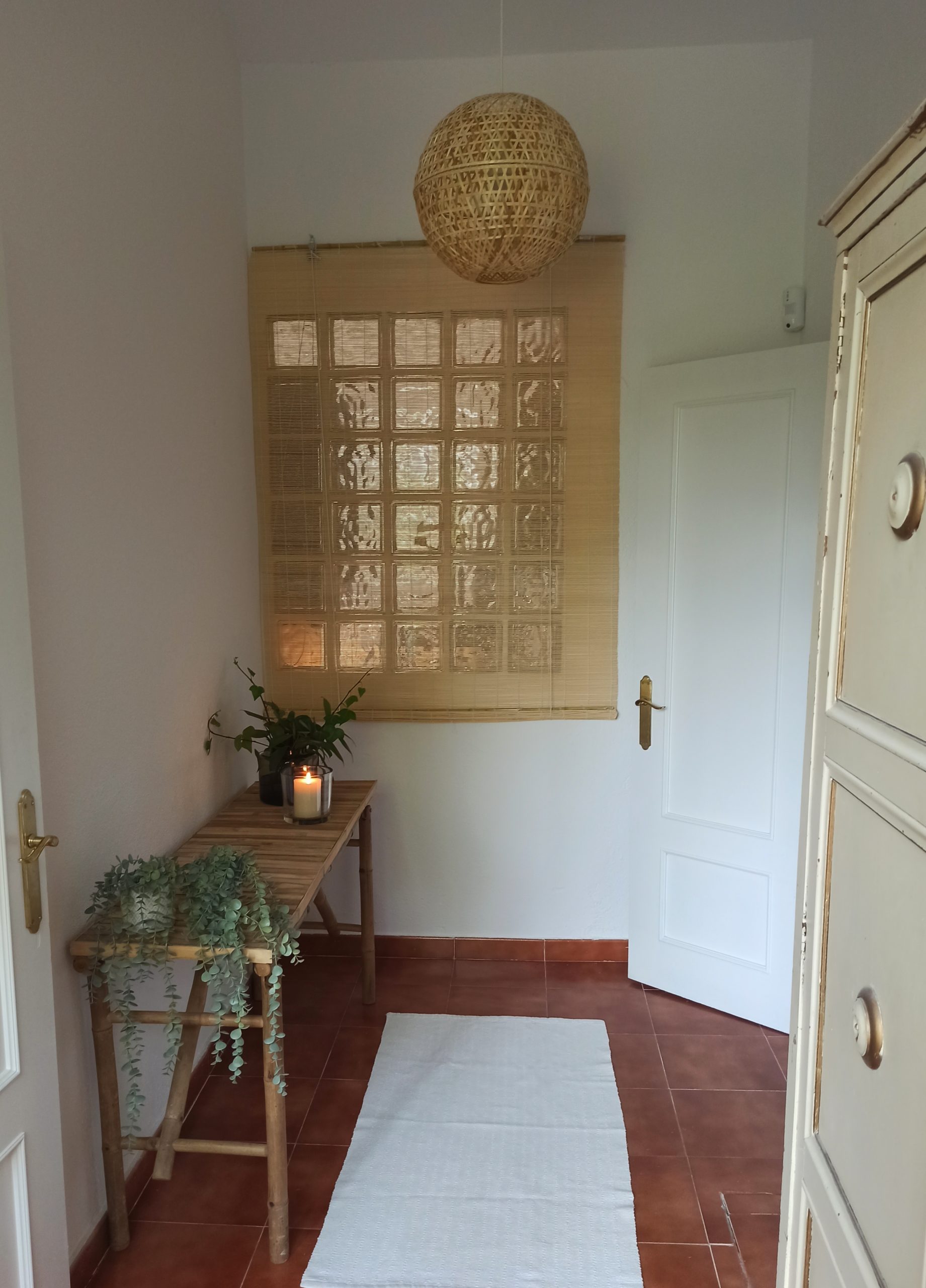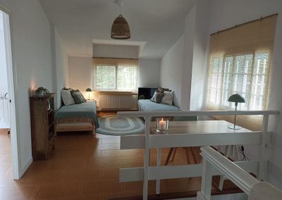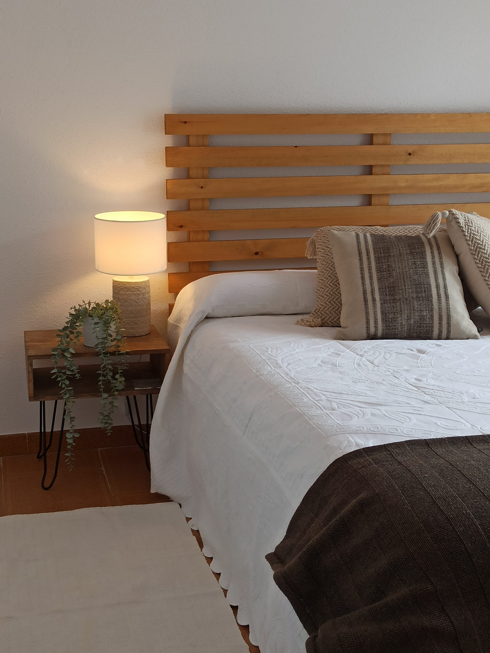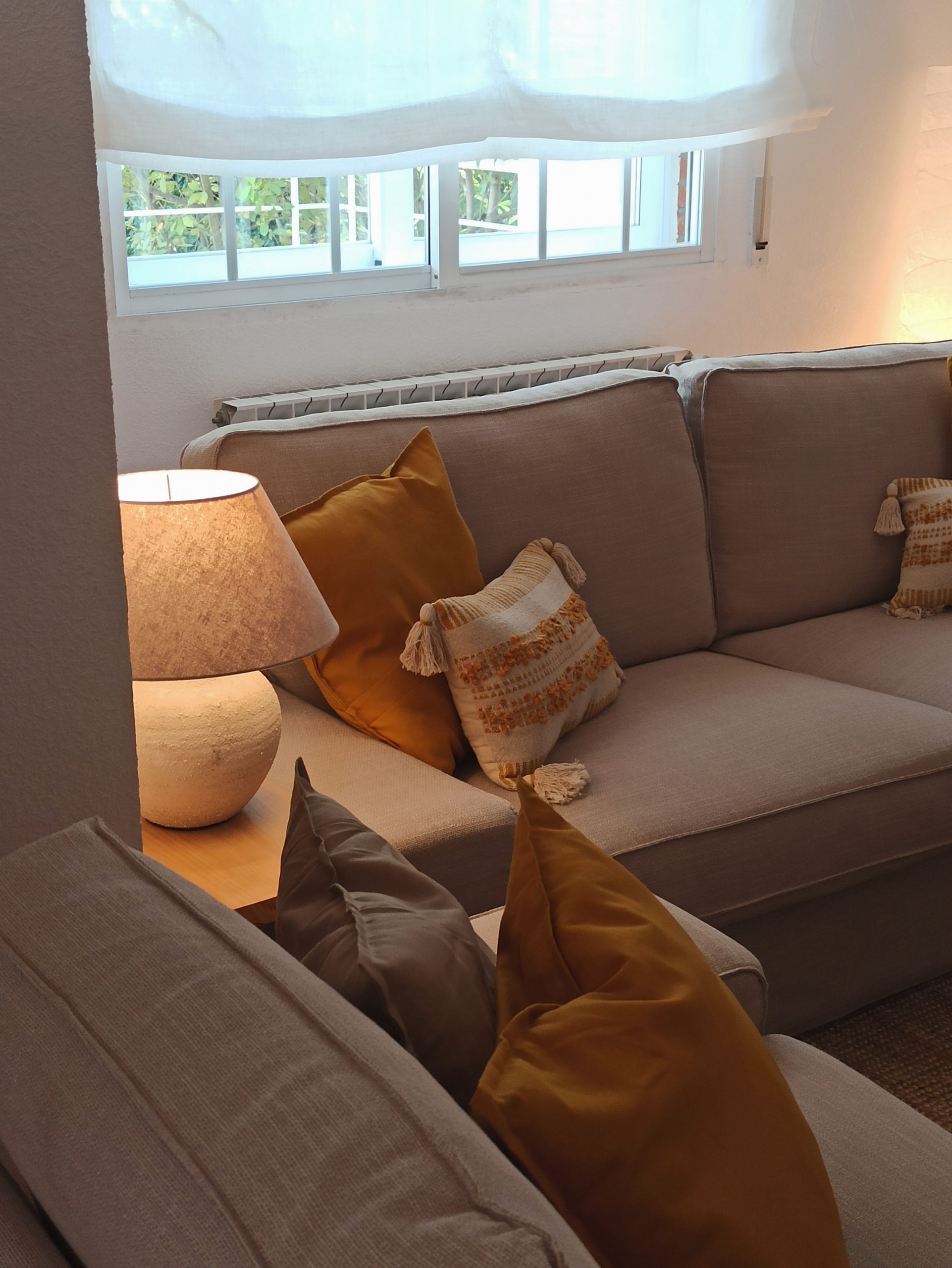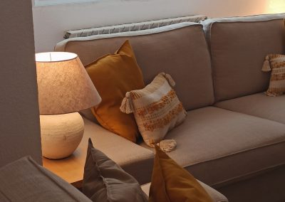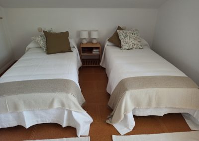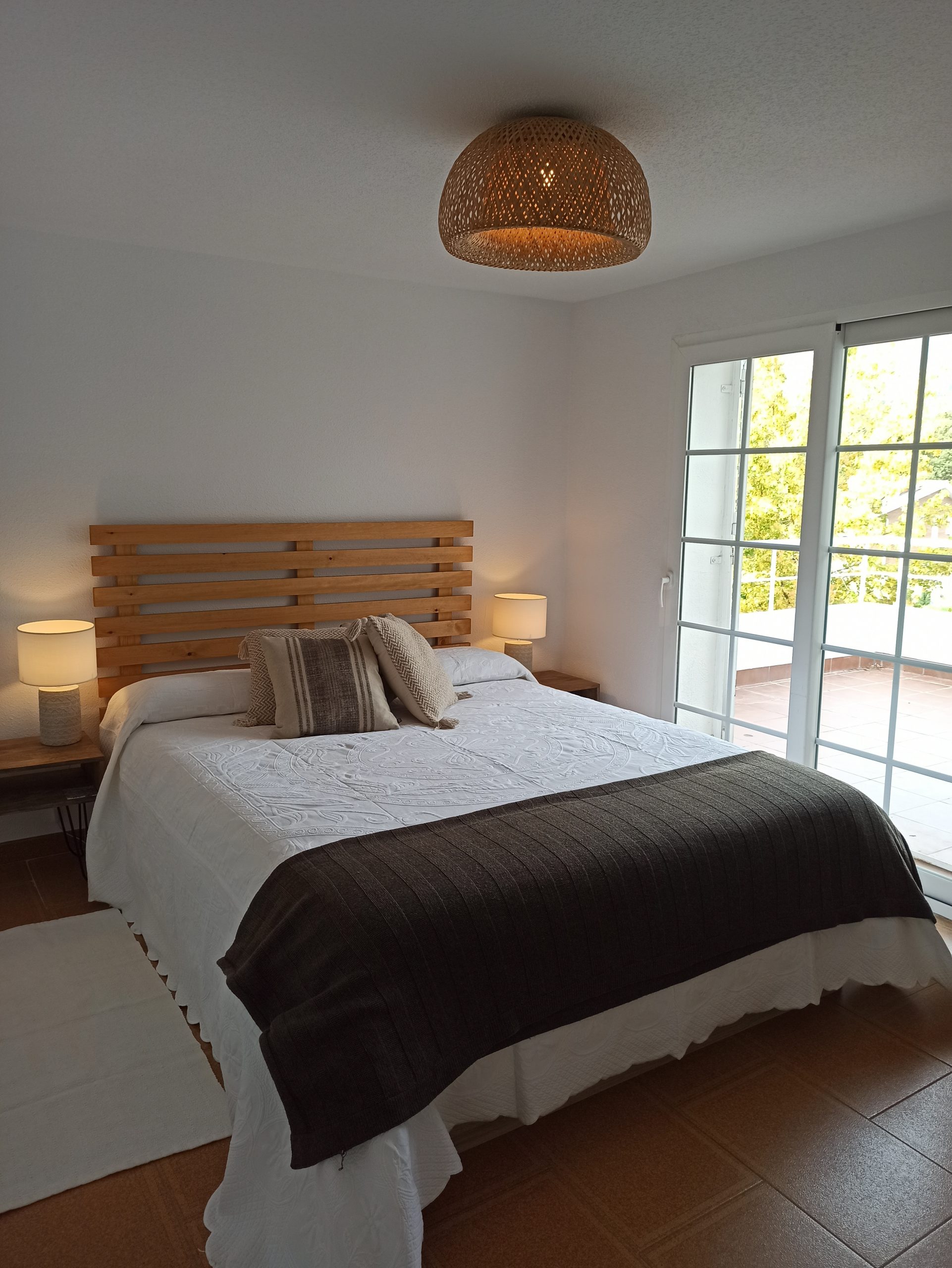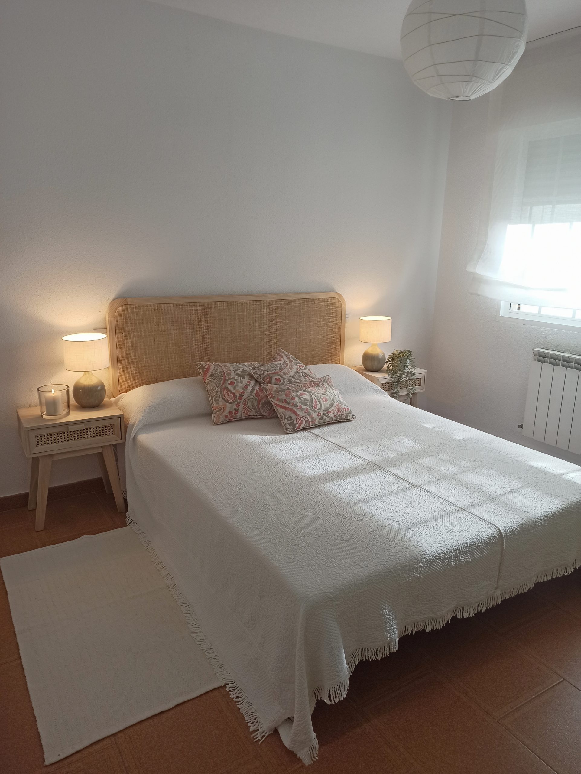 En cuanto al capítulo de decoración, y acorde al gusto de los clientes, se realiza un proyecto sencillo, con muebles de madera natural, y confecciones suaves (una diferente por cada estancia). Colchas blancas portuguesas en los dormitorios y accesorios de fibra y madera natural. Iluminación cálida y envolvente que hacen de la casa el perfecto refugio para fines de semana y vacaciones…