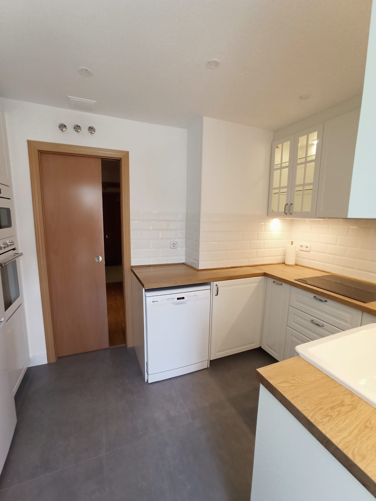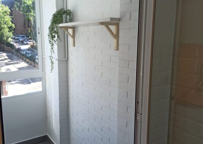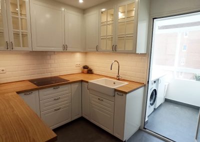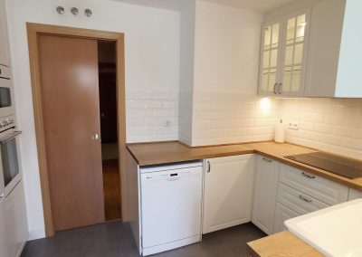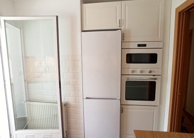 Comenzamos por incrementar el espacio de trabajo de la cocina, cambiando la puerta abatible existente, por una puerta corredera. De esta forma el perímetro de la cocina es completamente funcional. Quitamos la reja de la parte del lavadero y colocamos una ventana para proporcionar más luz natural a ambas estancias. Redistribuimos también algunos de los electrodomésticos para facilitar el funcionamiento adecuado de las tareas que se realizan en la estancia. En la distribución inicial, el friegaplatos no deja abrir el horno con comodidad y decidimos mover ambos para facilitar el uso diario.
