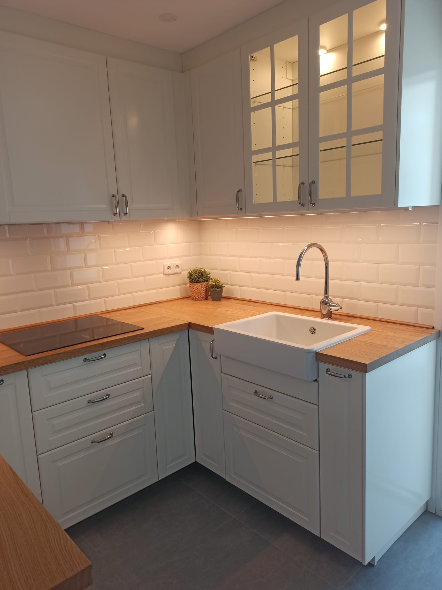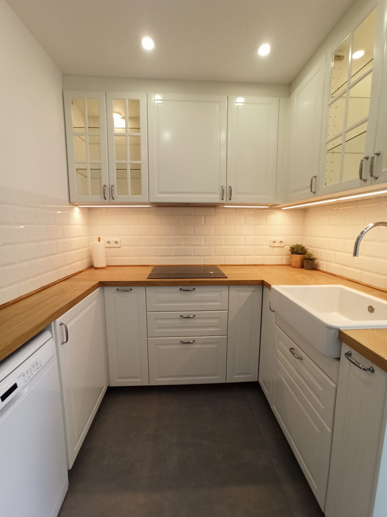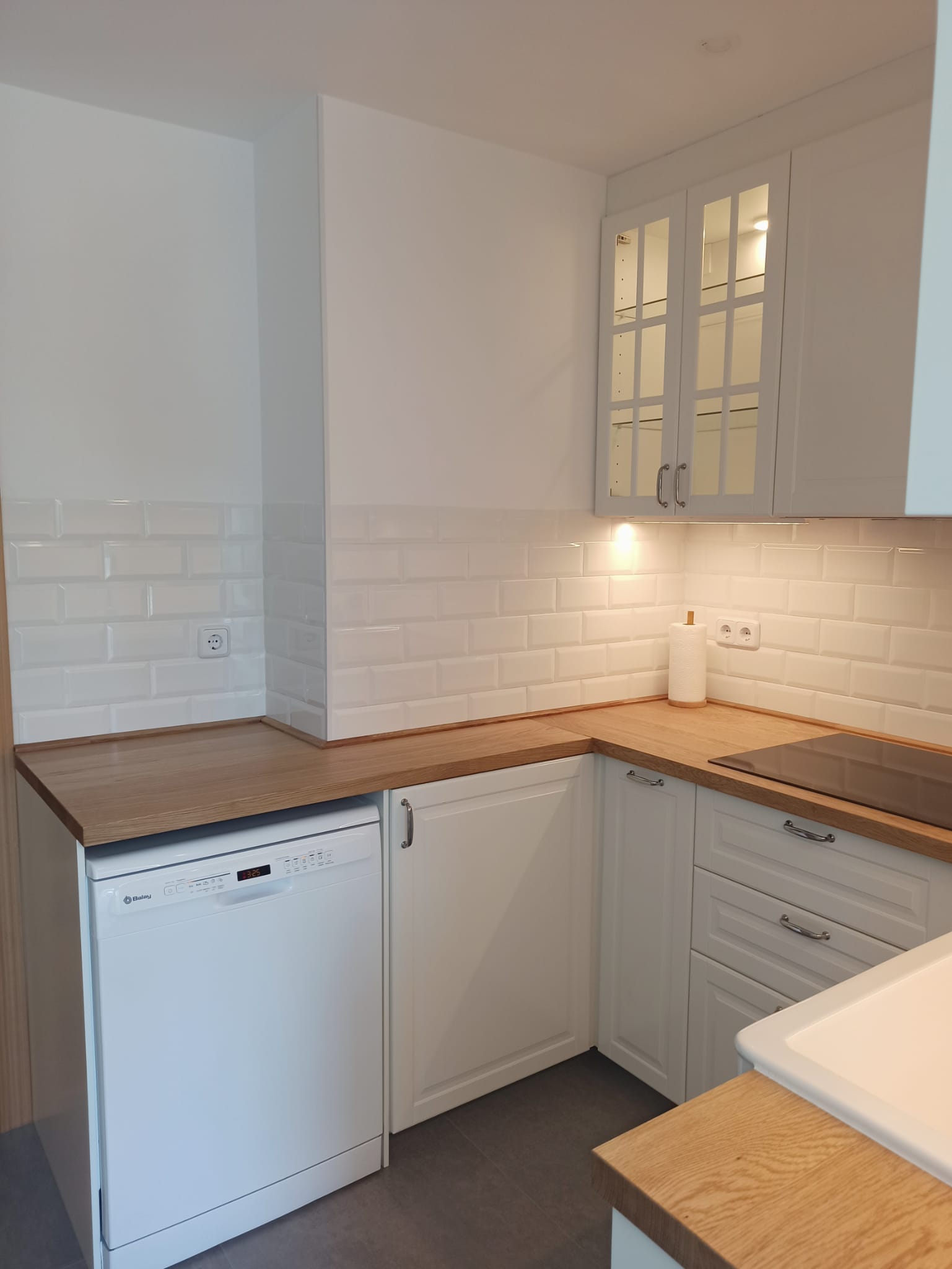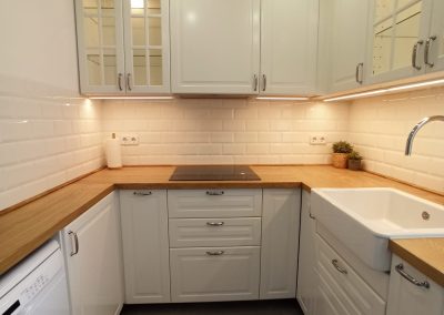 Incrementamos la iluminación general de la cocina y además colocamos luminarias sobre la encimera y en dos armarios-cristaleras, lo que cambia por completo la luminosidad de la estancia.
