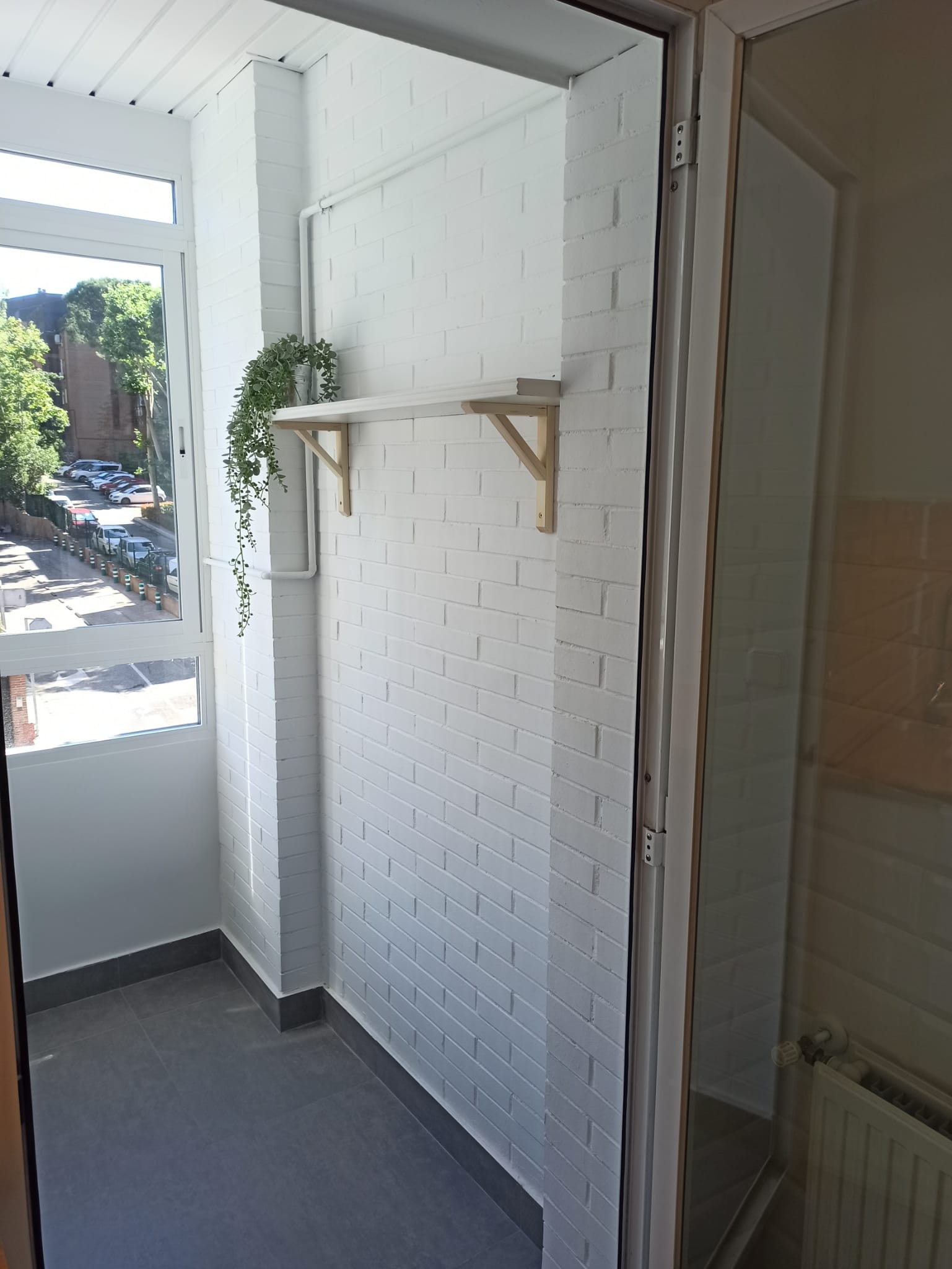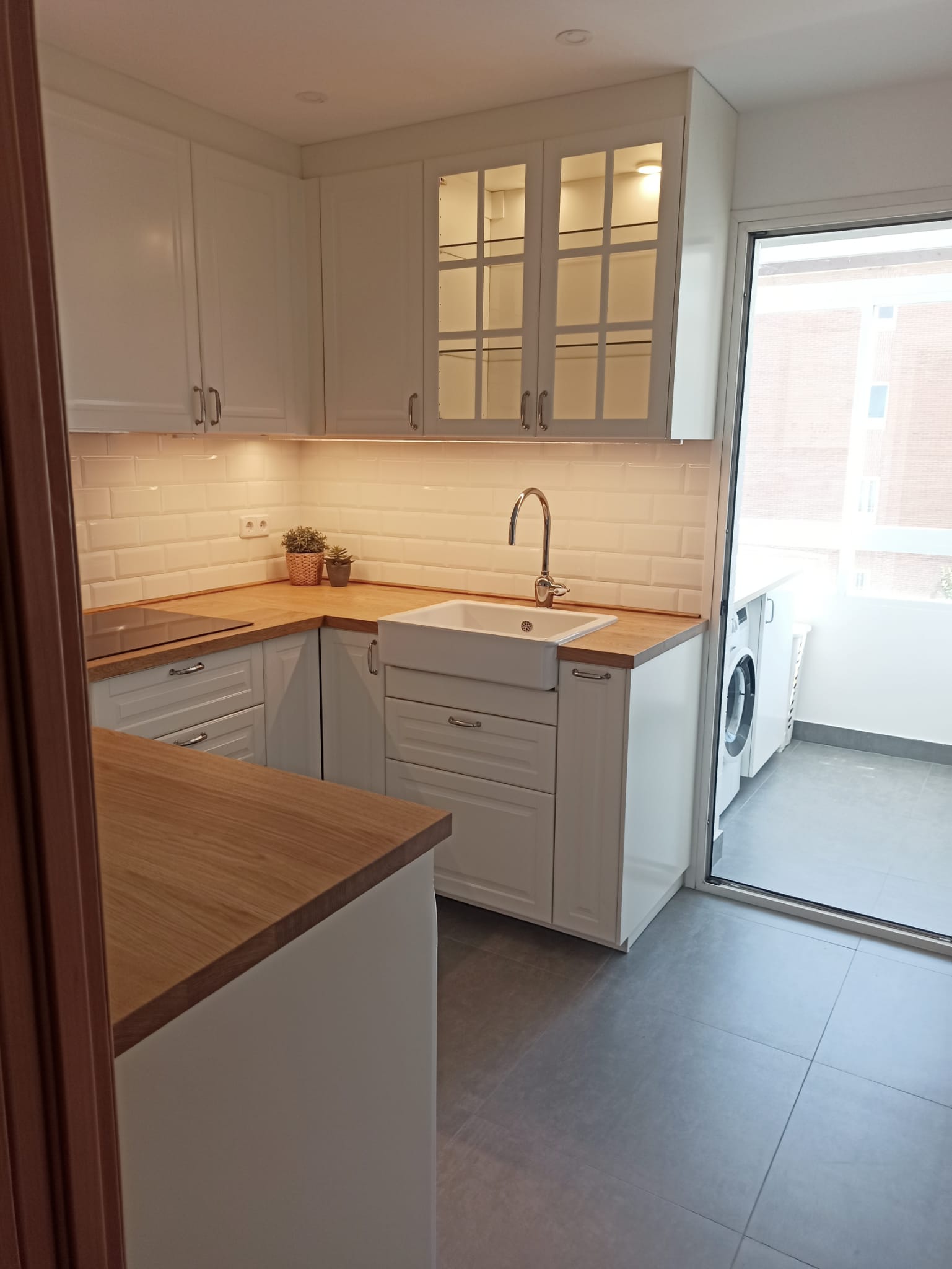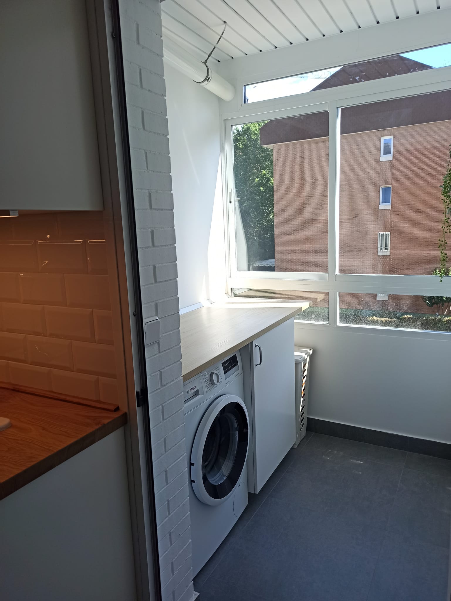 Para darle continuidad el lavadero, colocamos un solado gris que parte de la cocina. En esta zona, pintamos todo en blanco y reorganizamos la zona de lavado con una encimera laminada de madera y armarios para guardar elementos de limpieza. Con la nueva ventana, conseguimos luminosidad y aislamiento.