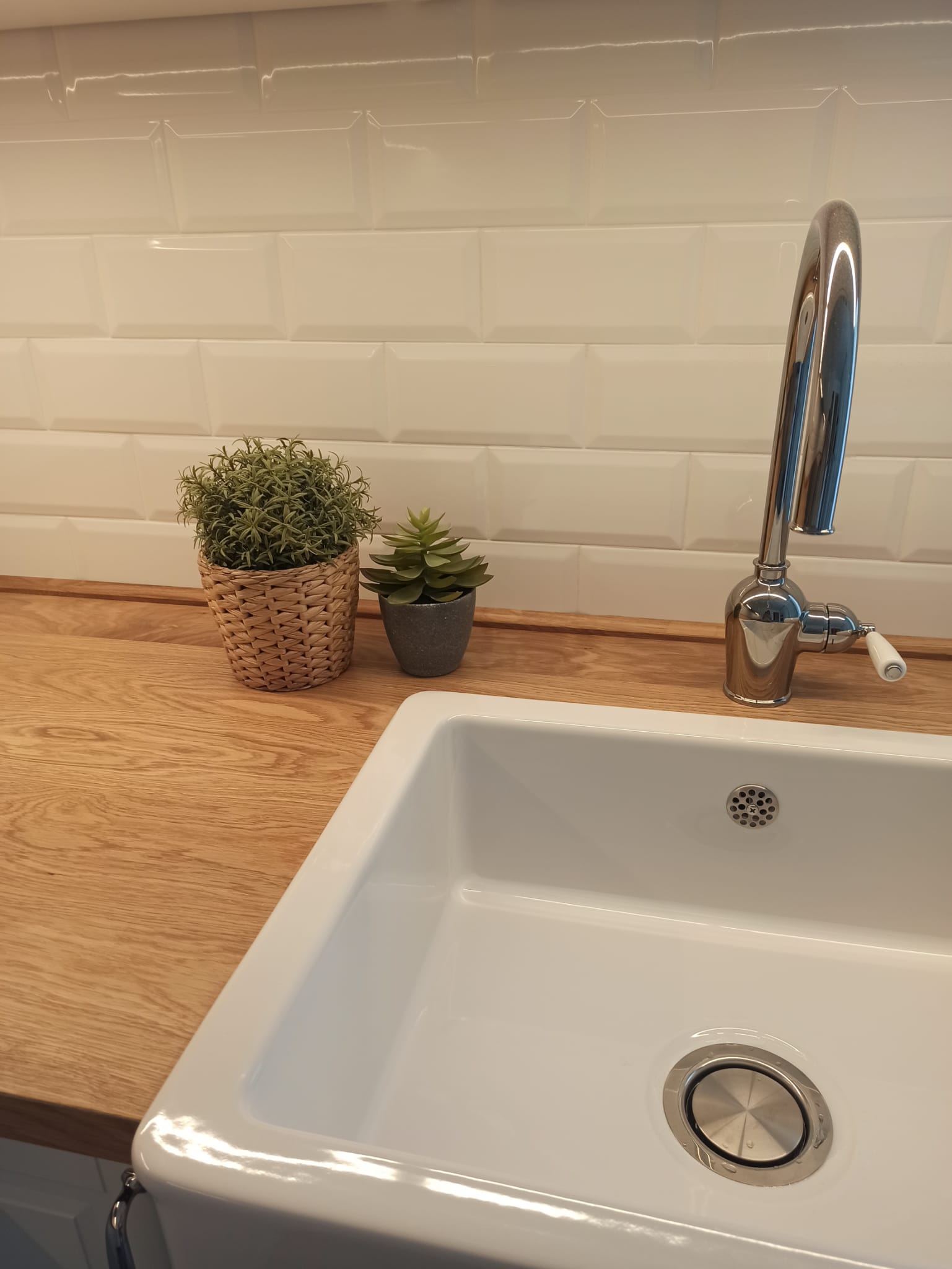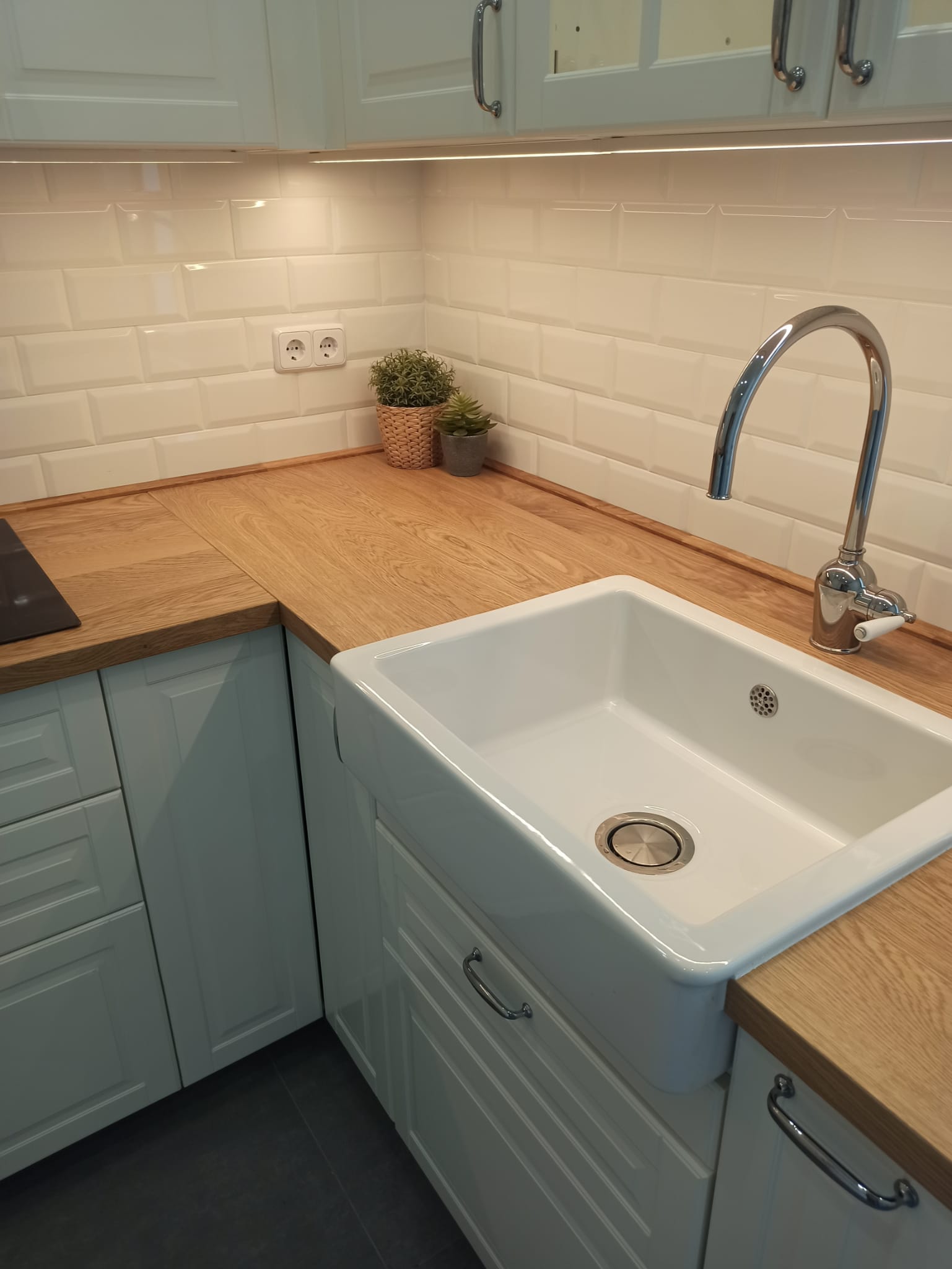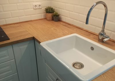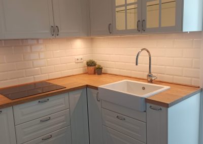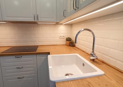 El diseño de la cocina, de acuerdo con los clientes, se define con armarios blancos con molduras, tiradores y apliques cromados y una encimera de madera maciza de roble.