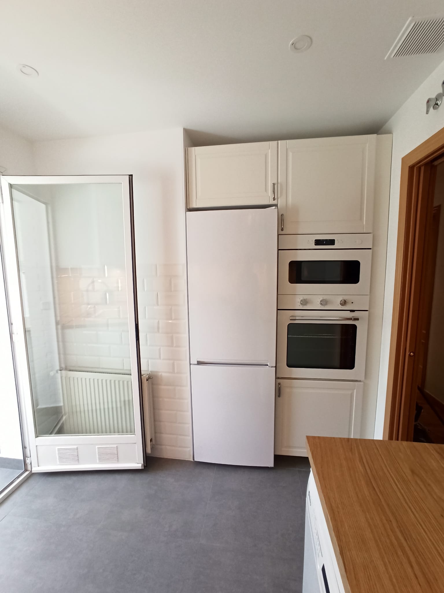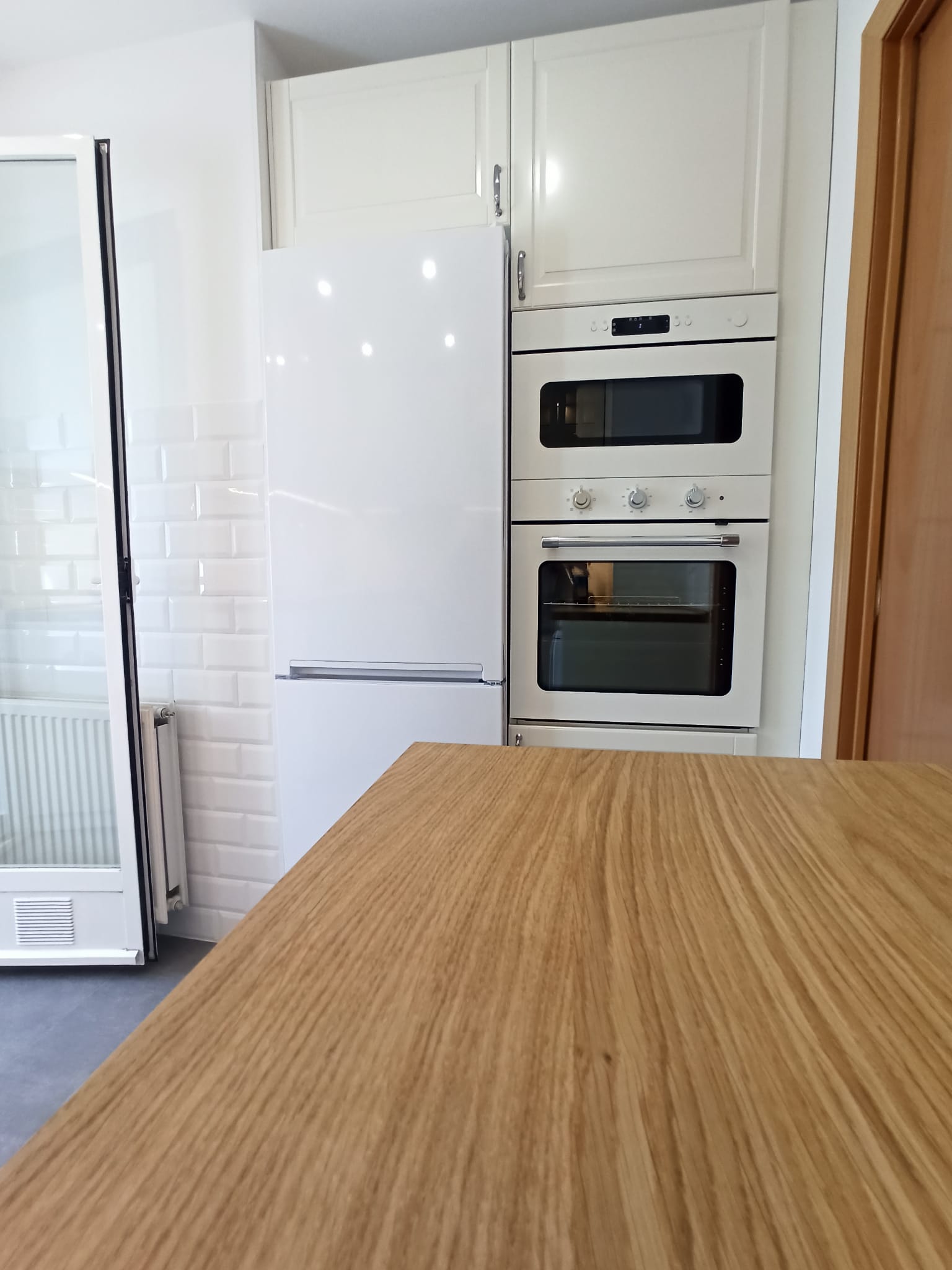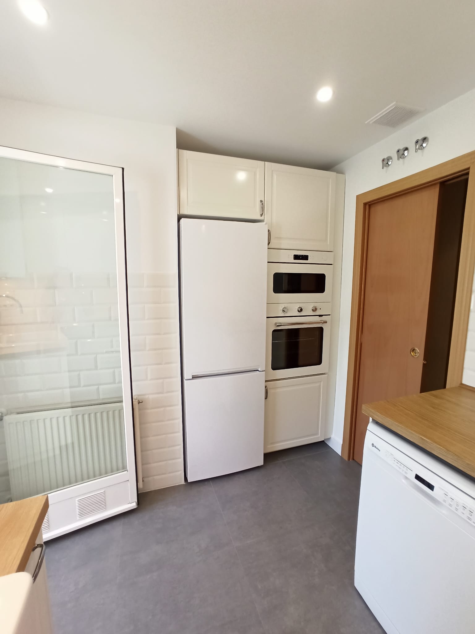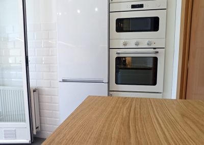Trasladamos el friegaplatos a una zona en la que anteriormente había un armarlo bajo y el horno lo colocamos junto al microondas, ambos integrados en una columna junto al frigorífico en un área que antes no tenía uso concreto. Reducimos los armarios altos que había en la estancia inicial,