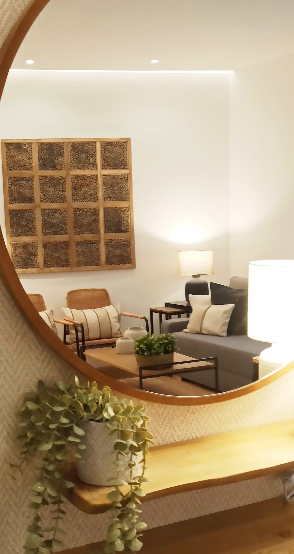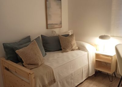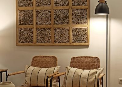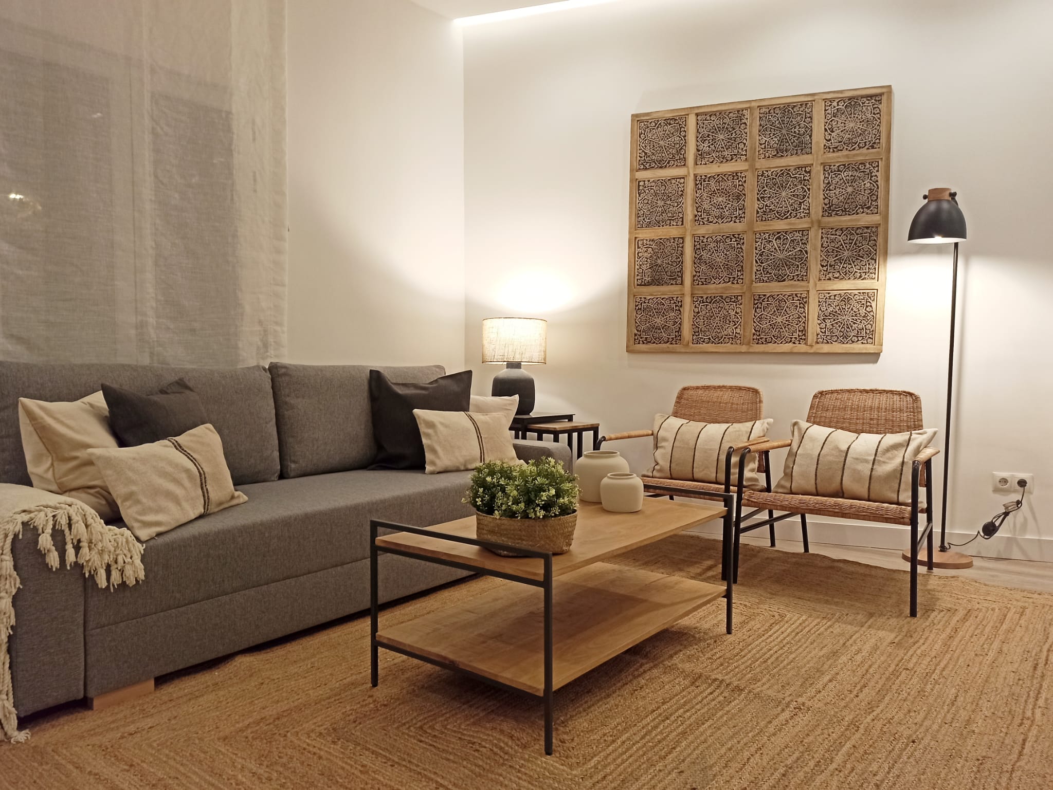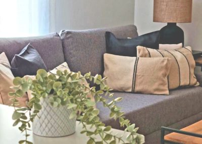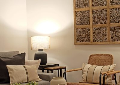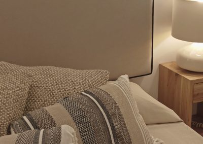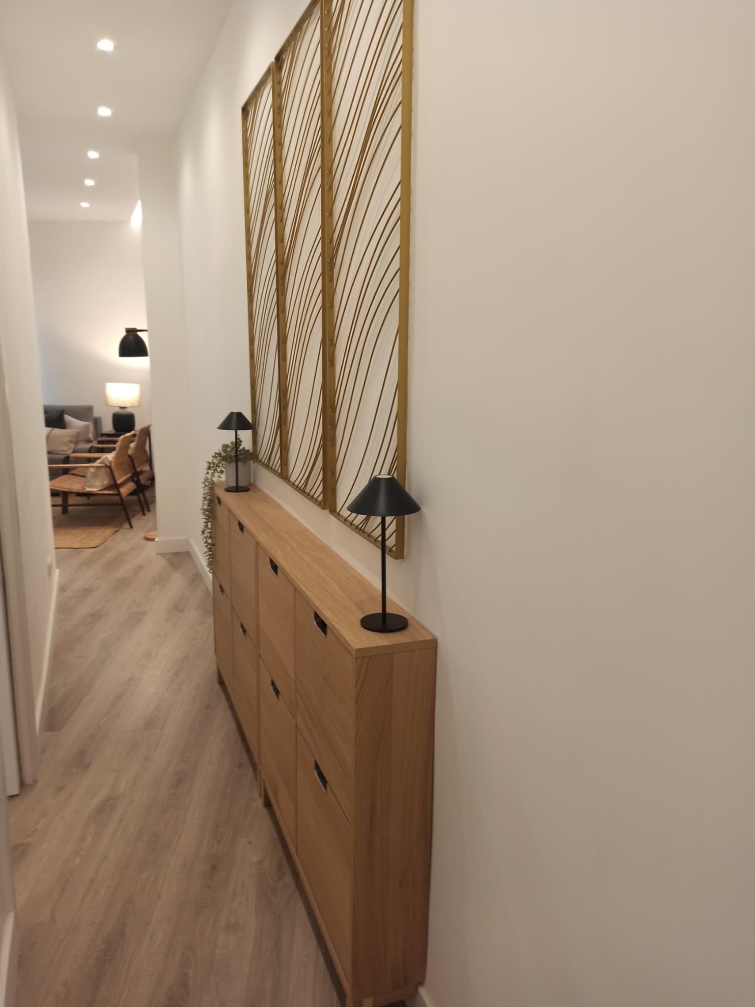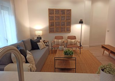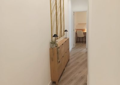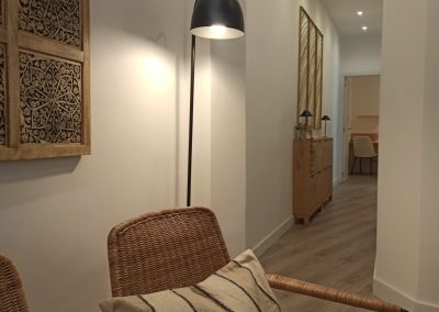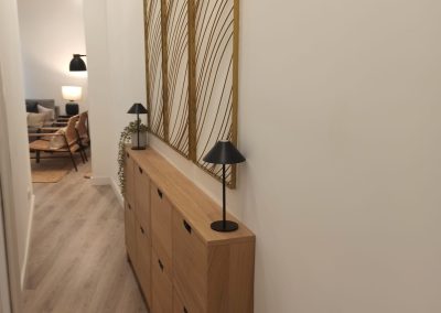 Además de la reforma, en este caso nos piden hacer el proyecto de decoración completo del piso. Junto con los dueños definimos un estilo y distribución sencilla basada en mobiliario cómodo y funcional, colores terrosos con un toque de color en confecciones, madera natural en muebles y forja en determinados puntos. Comenzamos colocando en la entrada de la casa unas sencillas baldas, espejo y lámpara que dan un aspecto cálido y de bienvenida. En el salón distribuimos mobiliario con las premisas anteriores y decoramos las paredes con detalles sencillos, buscando la armonía y la sensación de “hogar”. En todas las habitaciones, colchas tipo portugués con confecciones adecuadas e iluminación ambiental cálida. En el pasillo distribuidor, colocamos unos muebles zapateros estrechos, que sirven de almacenaje extra, y a la vez de corte visual, que completamos con decoración de pared. Toda la casa respira sencillez y luminosidad esperando la llegada de los inquilinos para disfrutar de ella.