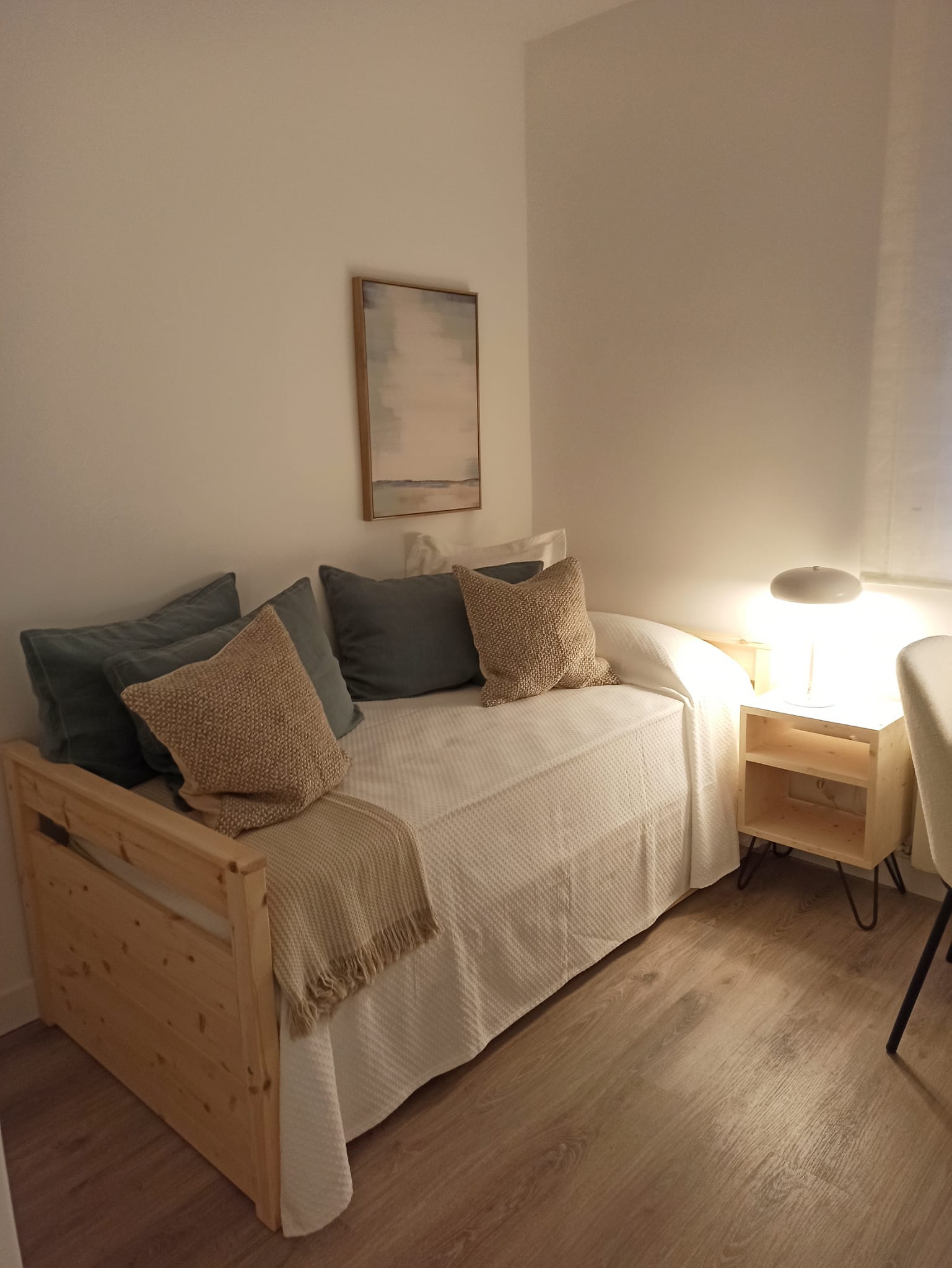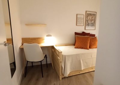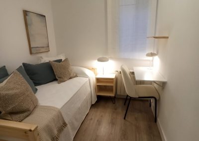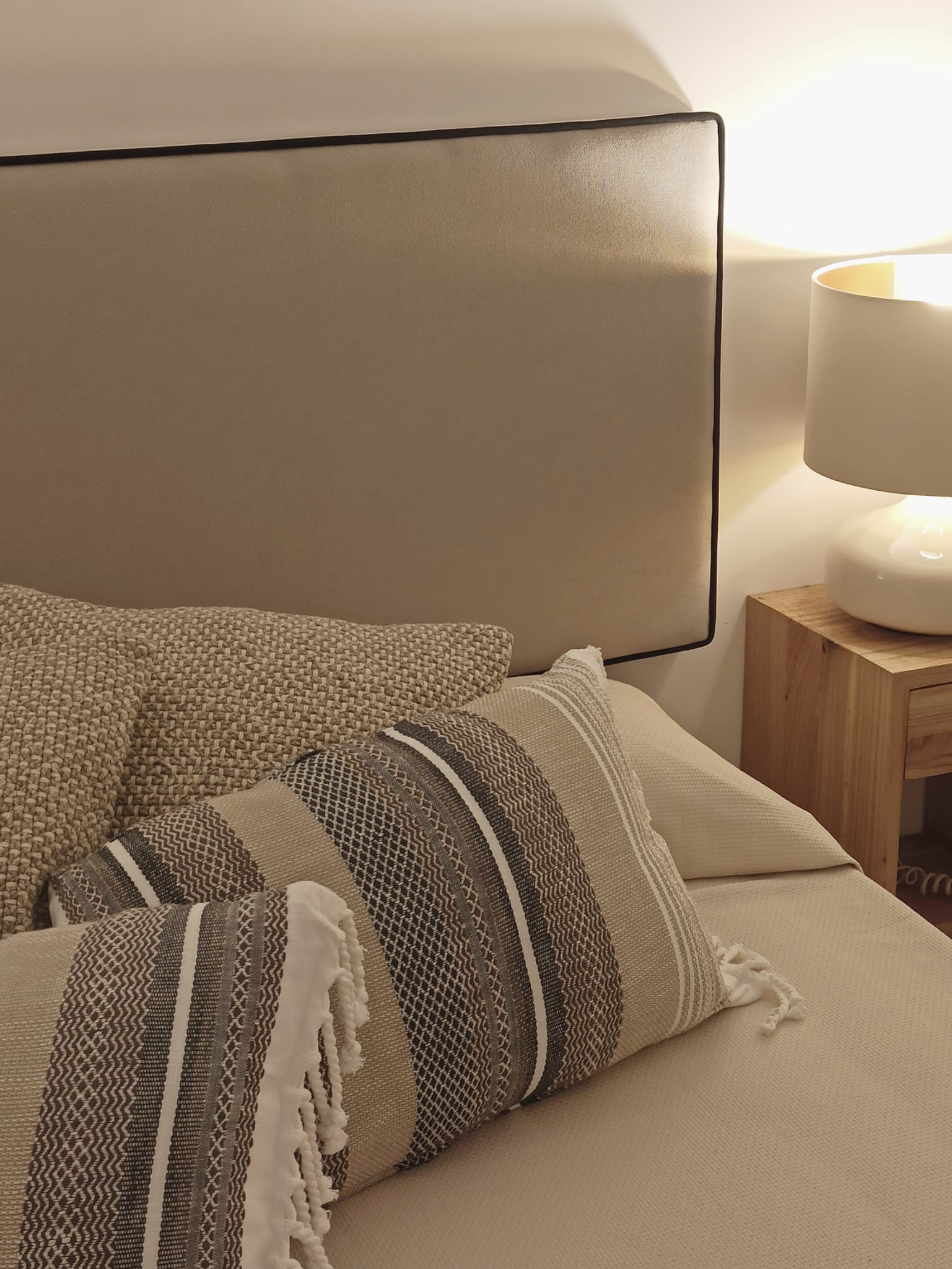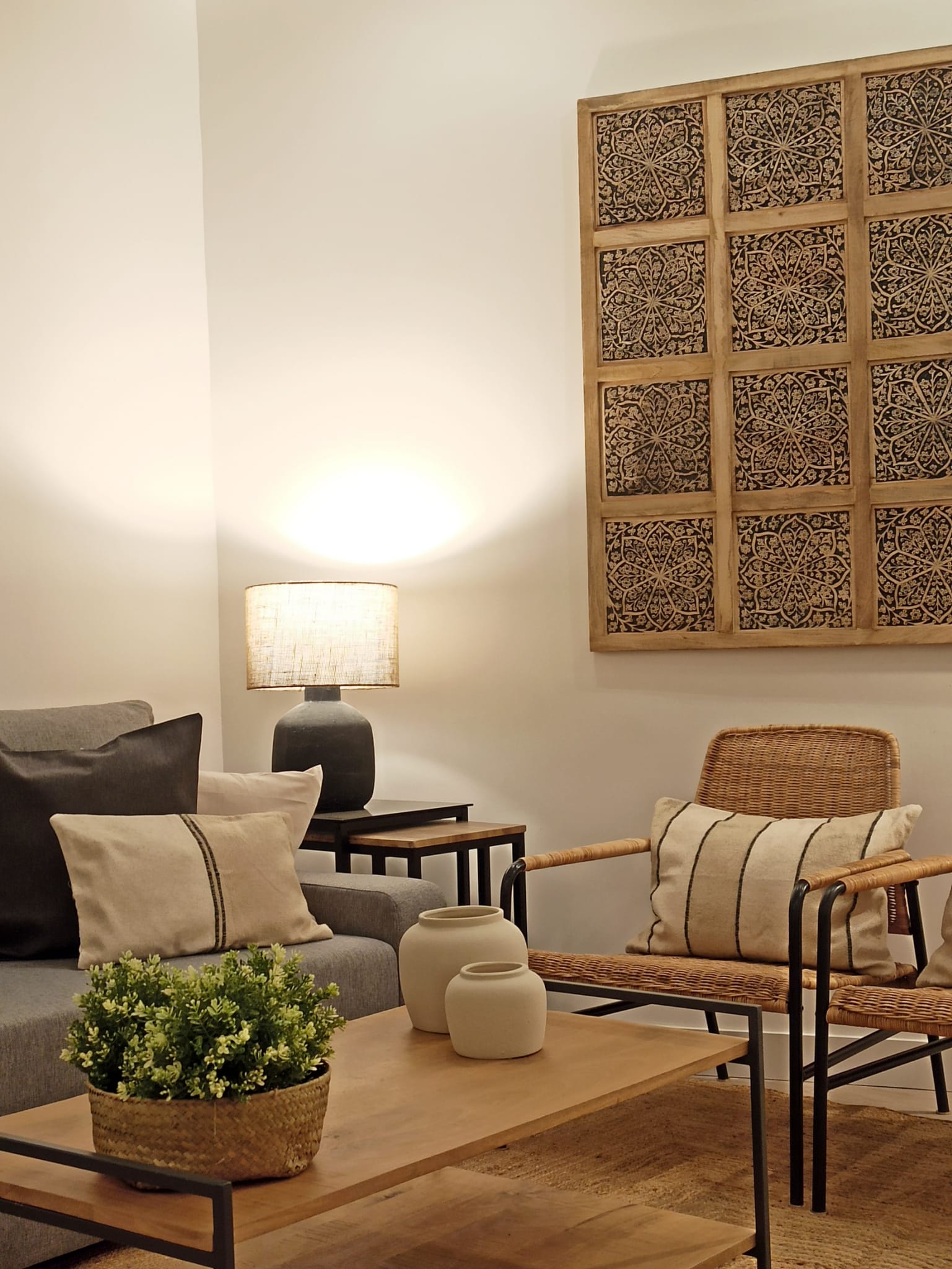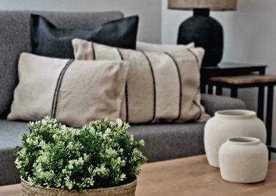 Además de la reforma, en este caso nos piden hacer el proyecto de decoración completo del piso. Junto con los dueños definimos un estilo y distribución sencilla basada en mobiliario cómodo y funcional, colores terrosos con un toque de color en confecciones, madera natural en muebles y forja en determinados puntos. Comenzamos colocando en la entrada de la casa unas sencillas baldas, espejo y lámpara que dan un aspecto cálido y de bienvenida. En el salón distribuimos mobiliario con las premisas anteriores y decoramos las paredes con detalles sencillos, buscando la armonía y la sensación de “hogar”. En todas las habitaciones, colchas tipo portugués con confecciones adecuadas e iluminación ambiental cálida. En el pasillo distribuidor, colocamos unos muebles zapateros estrechos, que sirven de almacenaje extra, y a la vez de corte visual, que completamos con decoración de pared. Toda la casa respira sencillez y luminosidad esperando la llegada de los inquilinos para disfrutar de ella.