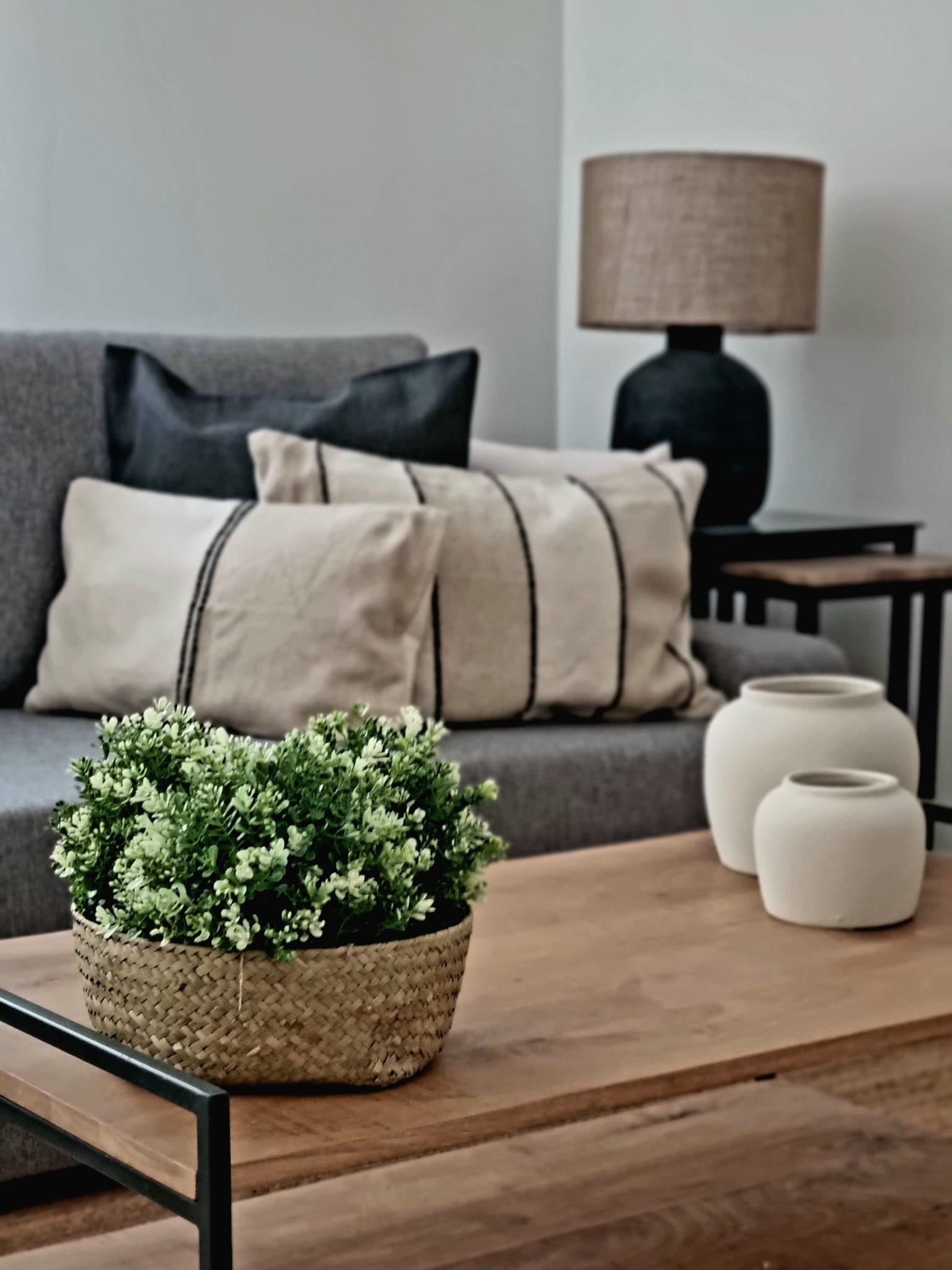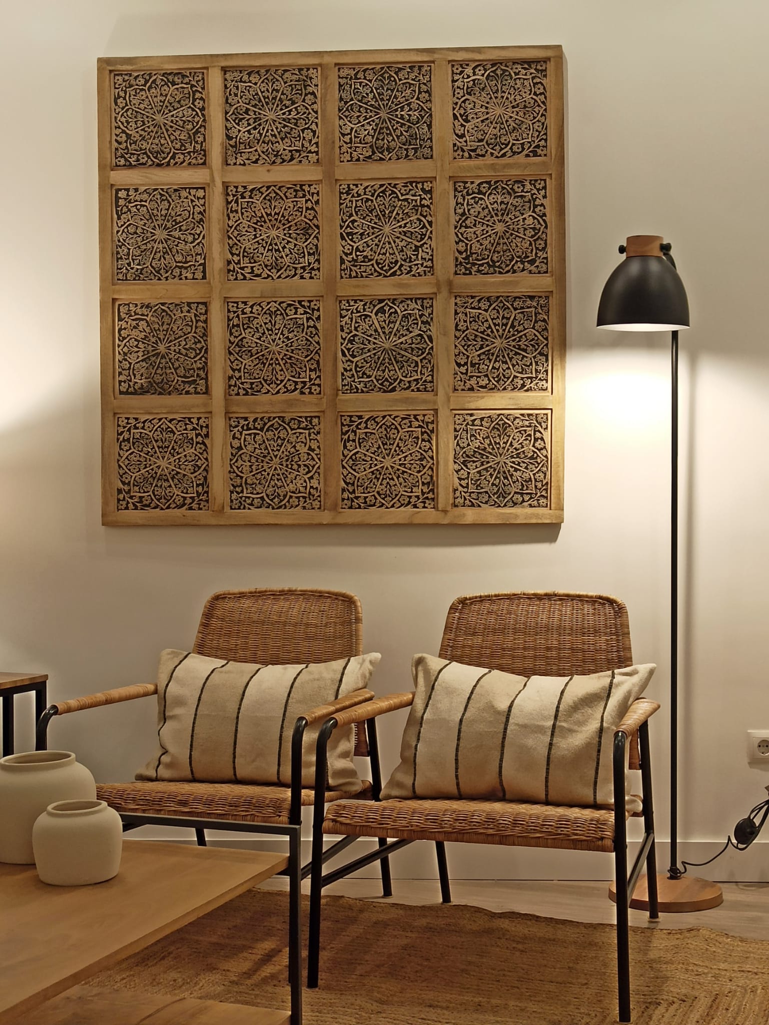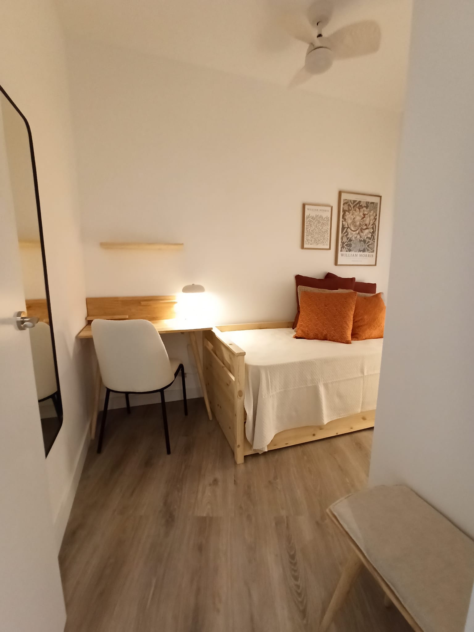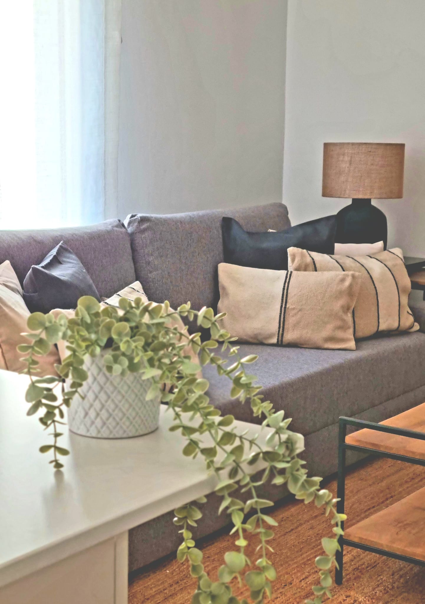 Además de la reforma, en este caso nos piden hacer el proyecto de decoración completo del piso. Junto con los dueños definimos un estilo y distribución sencilla basada en mobiliario cómodo y funcional, colores terrosos con un toque de color en confecciones, madera natural en muebles y forja en determinados puntos. Comenzamos colocando en la entrada de la casa unas sencillas baldas, espejo y lámpara que dan un aspecto cálido y de bienvenida. En el salón distribuimos mobiliario con las premisas anteriores y decoramos las paredes con detalles sencillos, buscando la armonía y la sensación de “hogar”. En todas las habitaciones, colchas tipo portugués con confecciones adecuadas e iluminación ambiental cálida. En el pasillo distribuidor, colocamos unos muebles zapateros estrechos, que sirven de almacenaje extra, y a la vez de corte visual, que completamos con decoración de pared. Toda la casa respira sencillez y luminosidad esperando la llegada de los inquilinos para disfrutar de ella.