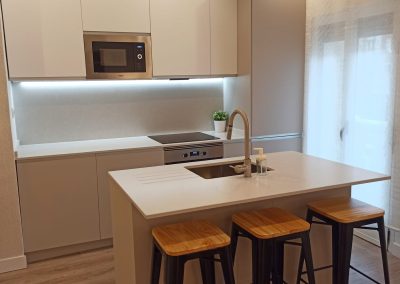 Inicialmente, el piso consta de 4 dormitorios pequeños, un largo pasillo sin iluminación adecuada, y un salón-cocina muy reducido en la zona del patio interior de la vivienda. Decidimos trasladar el salón con cocina integrada a la zona exterior de la vivienda, con mucha más luz y en la zona de entrada de la casa. Mantenemos 3 dormitorios y los dos baños, uno de los cuales lo hacemos en suite para el dormitorio principal. Distribuimos en cada dormitorio armarios a medida con maleteros, como espacio de almacenamiento, que no existía en la vivienda anteriormente. Decidimos integrar la cocina en el salón con un concepto abierto y una pequeña isla que hace las veces de barra de desayuno.